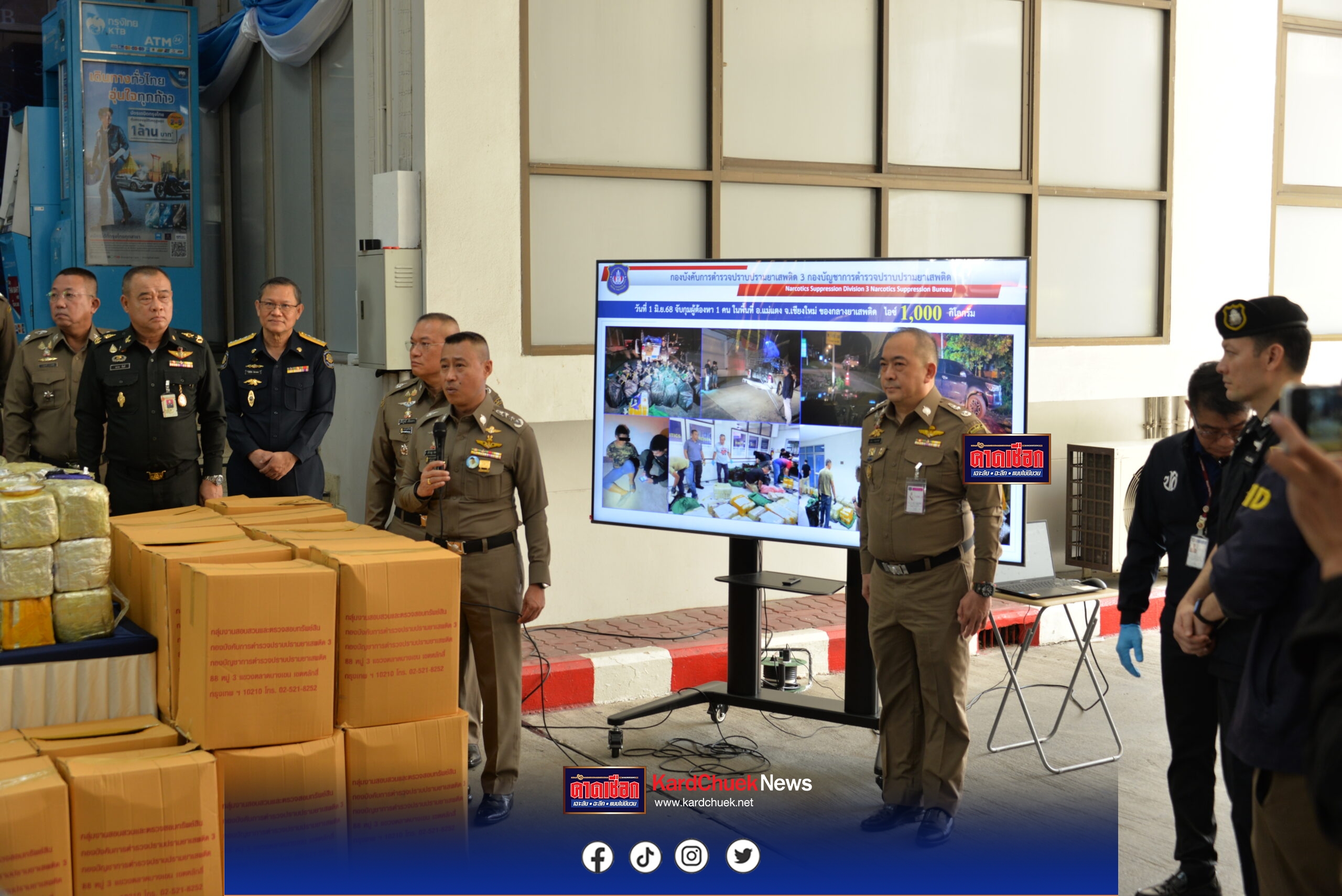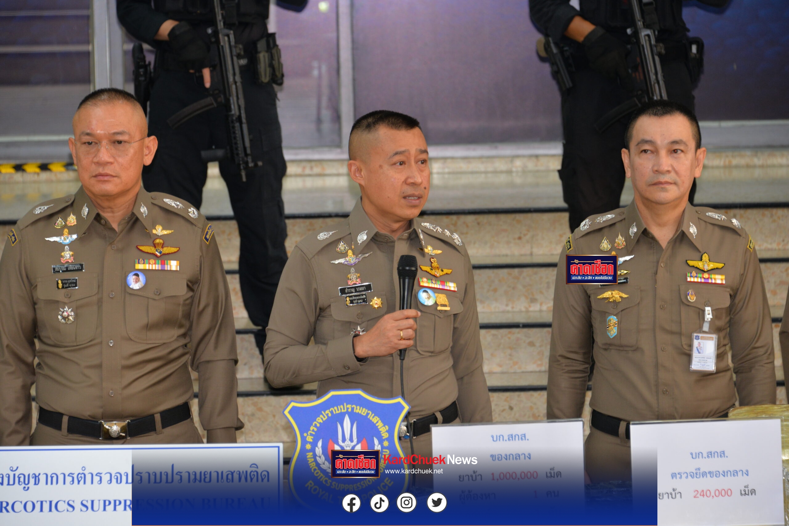 ผู้ช่วยฯ สำราญ ร่วมแถลงการกวาดล้างครั้งใหญ่! ยึดยาบ้า – ไอซ์ทะลักกว่า 7 ล้านเม็ด ไอซ์1 ตัน วันที่ 6 มิ.ย.68 ที่กองบังคับการปราบปรามยาเสพติด เขตหลักสี่ กทม. พล.ต.ท.สำราญ นวลมา ในฐานะ รอง ผอ.ศอ.ปส.ตร. ร่วมแถลงการจับกุมและยึดทรัพย์เครือข่ายยาเสพติด โดยมีพล.ต.ท.สันติ ชัยนิรามัย ผบช.ปส.,พล.ต.ต.สมบูรณ์ เทียนขาว, พล.ต.ต.ออมสิน ตรารุ่งเรือง, พล.ต.ต.พรศักดิ์ สุรสิทธิ์, พล.ต.ต.ธนรัชน์ สอนกล้า รอง ผบช.ปส., คอยให้การต้อนรับ โดยบช.ปส. ได้บูรณาการกำลังร่วมกับเจ้าหน้าที่ทหาร, นบ.ยส.35 และ ป.ป.ส., พล.ต.ฉกาจ ขันตี ผู้อำนวยการศูนย์ประสานการปฏิบัติที่ 2 กองอำนวยการรักษาความมั่นคงภายในราชอาณาจักร โดยจับกุมเครือข่ายยาเสพติดรายสำคัญของ บช.ปส. จำนวน 5 คดี ผู้ต้องหา 7 คน รถยนต์ของกลาง 7 คัน ของกลางยาเสพติดคือยาบ้า 7,810,000 เม็ด และไอซ์ 1,000 กิโลกรัม ดังนี้ บก.สกส. คดี ยาบ้า 2,000,000 เม็ด นำโดยพ.ต.อ.มงคล ออมทรัพย์ ผกก.3 บก.สกส. เมื่อวันที่ 24 พฤษภาคม 2568 เวลาประมาณ 05.00-11.30 น. บก.สกส.บช.ปส., ภ.6 และเจ้าหน้าที่ทหาร นบ.ยส.35, นปส.ขทก.ศปก.ทบ. ร่วมกันจับกุมผู้ต้องหา 3 คน พร้อมของกลางยาบ้า 2,000,000 เม็ด สืบเนื่องจาก กก.3 บก.สกส. ได้รับแจ้งจากสายลับว่า มีนายเต๋ง กับพวกมีพฤติการณ์ลักลอบลำเลียงยาเสพติด ใช้รถยนต์สีขาว หมายเลขทะเบียน บม xxxx พะเยา และรถยนต์ สีเทา หมายเลขทะเบียน ชส xxxx กรุงเทพ ในการลำเลียงยาเสพติดจากพื้นที่ภาคเหนือ ในพื้นที่ อ.เทิง จ.เชียงราย และจะนำมาส่งให้ลูกค้าในพื้นที่ จ.เพชรบูรณ์ และพื้นที่ใกล้เคียง ใช้เส้นทางจาก อ.เทิง จ.เชียงราย – จ.พะเยา – จ.แพร่ – จ.อุตรดิตถ์ – จ.พิษณุโลก ปลายทาง จ.เพชรบูรณ์ จึงเฝ้าสืบสวนเรื่อยมา จนกระทั่งวันที่ 23 พ.ค.68 พบความเคลื่อนไหวรถยนต์กลุ่มดังกล่าวในพื้นที่ จ.อุตรดิตถ์ จึงจัดชุดสะกดรอยติดตาม จนมาถึง อ.วังทอง จ.พิษณุโลก เจ้าหน้าที่ชุดจับกุมได้แสดงตัวเข้าสกัดกั้นรถยนต์ทั้ง 2 คัน รถยนต์หมายเลขทะเบียน ชส xxxx กรุงเทพฯ พบนายเต๋ง และ น.ส.ปาณิสรา อยู่ภายในรถ ส่วนรถยนต์หมายเลขทะเบียน บน xxxx พะเยา เร่งความเร็วเฉี่ยวชนกับรถยนต์ของเจ้าหน้าที่ตำรวจ เลยเสียหลักลงข้างทางแต่ผู้ขับขี่หลบหนีไปได้ ตรวจค้นภายในรถพบยาบ้า 2 ล้านเม็ด ต่อมาสามารถขยายผลตามจับกุมนายประเสริฐ ที่วิ่งหลบหนี ได้บริเวณสถานีขนส่งผู้โดยสาร จ.พิษณุโลก จึงแจ้งข้อกล่าวหาบุคคลทั้ง 3 และนำตัวผู้ต้องหาพร้อมของกลางทั้งหมดส่งให้ พงส.ดำเนินการตามกฎหมายต่อไป คดี ยาบ้า 4,570,000 เม็ด นำโดย พ.ต.อ.มงคล ออมทรัพย์ ผกก.3 บก.สกส. เมื่อวันที่ 29 พ.ค.68 เวลาประมาณ 14.20 น. บก.สกส.และ เจ้าหน้าที่ทหาร ขกท.ศปก.ทบ. ร่วมกันทำการจับกุมตัวผู้ต้องหา 2 คน พร้อมของกลางยาบ้า 4,570,000 เ
