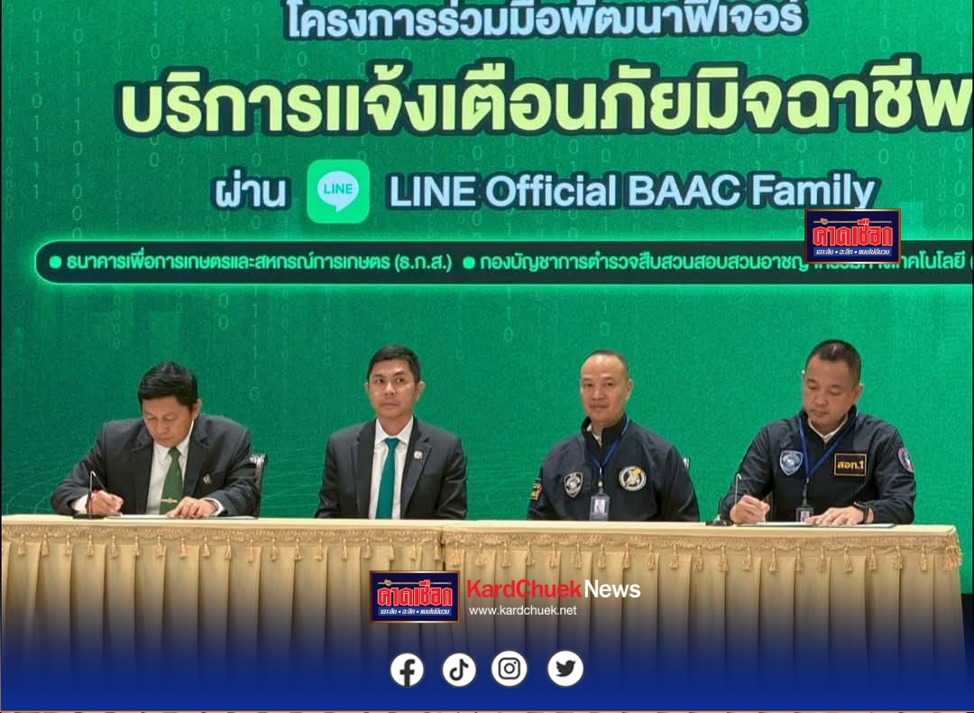 ไซเบอร์อรรถ ผู้การอ้อ ร่วมงาน ธ.ก.ส. จับมือ ตำรวจไซเบอร์ เดินหน้าเสริมแกร่งความปลอดภัยทางไซเบอร์ให้ประชาชนทั่วประเทศ เปิดตัวฟีเจอร์ใหม่ “บริการแจ้งเตือนภัยมิจฉาชีพ” บน LINE Official BAAC Family