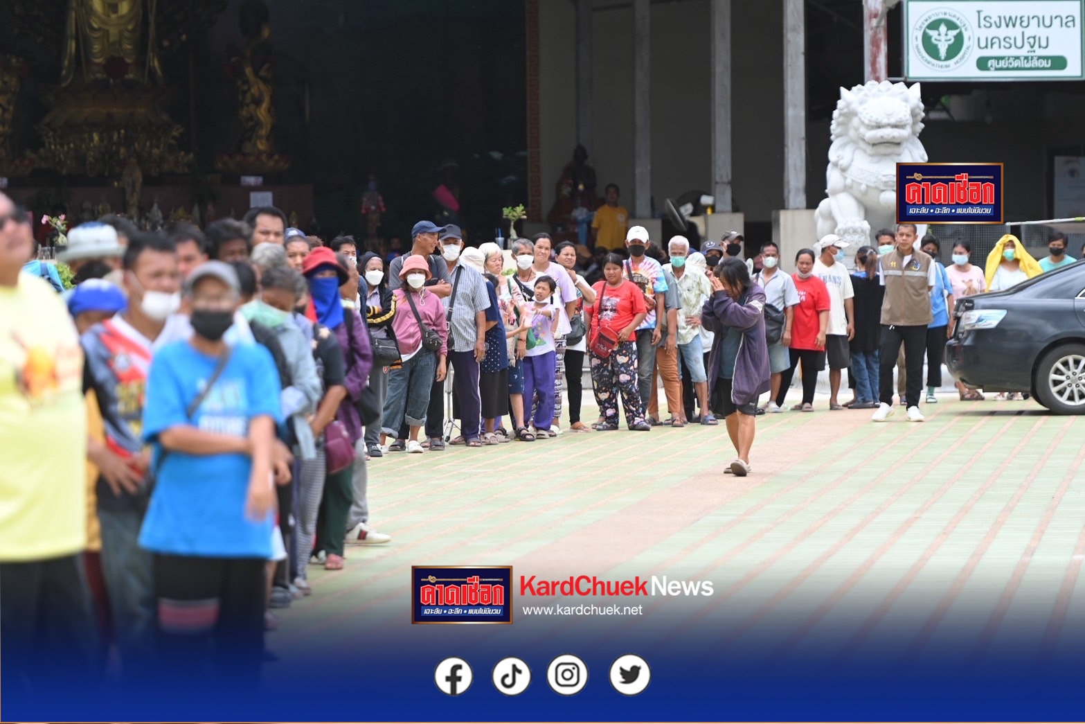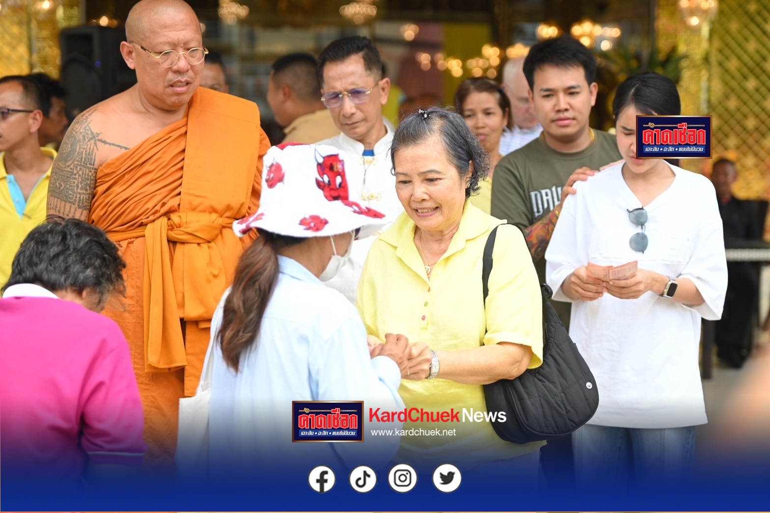 ต่อมาในช่วงเวลาประมาณ 13.00 น. หลวงพี่น้ำฝน ได้นำเหล่าศิษยานุศิษย์ทำการแจกทานให้กับผู้ยากไร้ซึ่งมารอรับตั้งแถวอยู่ที่ด้านหน้าวิหารพระพุทธเมตตาประทานพร ราว 800 คน ซึ่งทุกคนที่มาร่วมงานจะรับประทานอาหารคาวหวาน พร้อมเครื่องดื่มฟรีไม่อั้น ซึ่งเมื่อรับประทานอาหารเสร็จสิ้นแล้วจึงได้มีการต่อคิวเข้าแถวเพื่อรับเงินยังชีพอีกคนละ 100 บาท เพื่อไว้ให้สำหรับเป็นเงินติดตัวในการเดินทางและจับจ่ายใช้สอยต่อไป