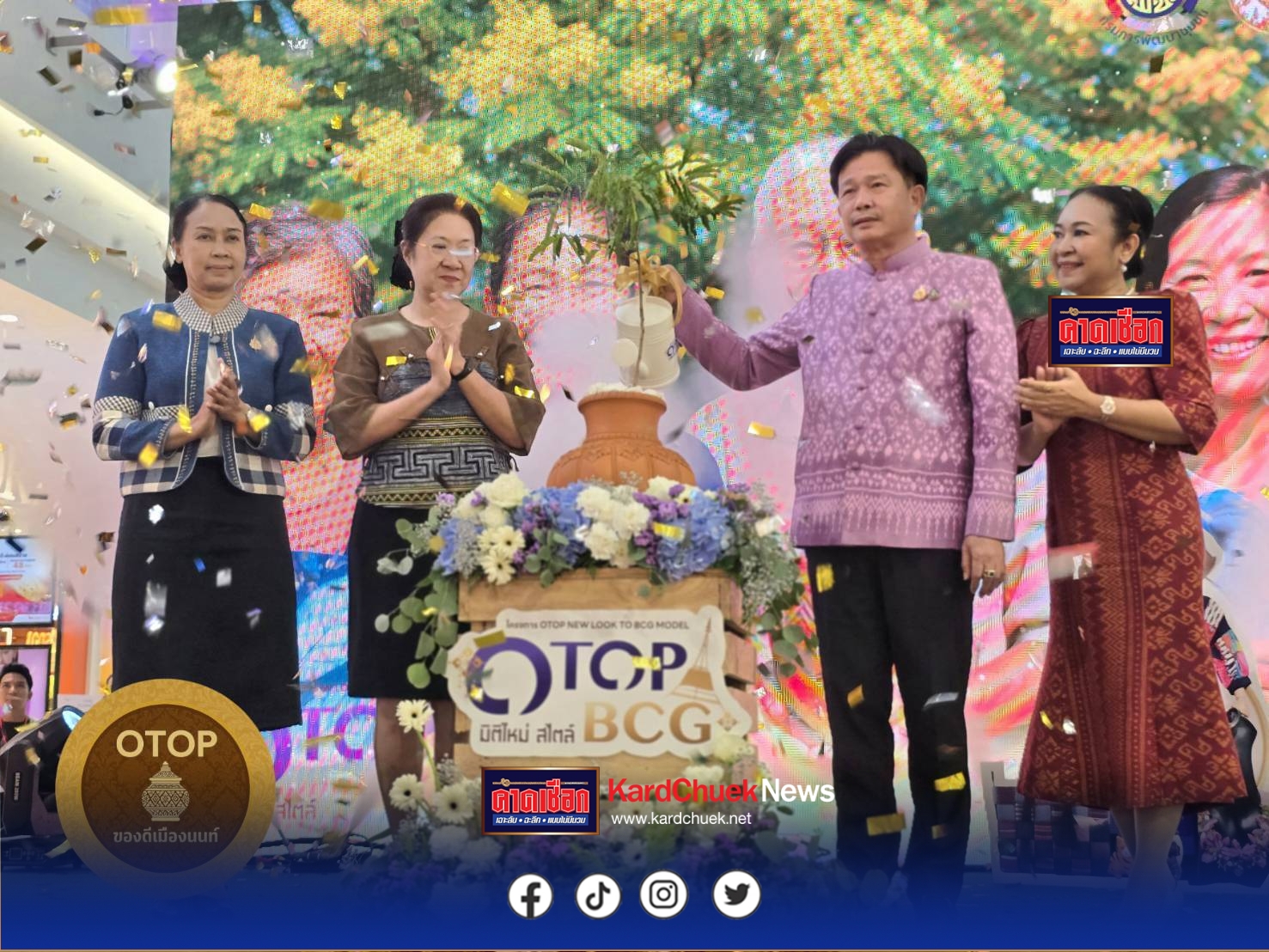นนทบุรีเปิดงาน “OTOP มิติใหม่ สไตล์ BCG” ยกระดับเศรษฐกิจฐานรากอย่างยั่งยืน เมื่อวันที่ 24 มิถุนายน 2568 เวลา 18.00 น. ณ โรบินสันไลฟ์สไตล์ ราชพฤกษ์ จังหวัดนนทบุรี ได้จัดพิธีเปิดงาน “OTOP มิติใหม่ สไตล์ BCG” โดยมี นายเกียรติศักดิ์ ตรงศิริ ผู้ว่าราชการจังหวัดนนทบุรี ให้เกียรติเป็นประธานในพิธีเปิด พร้อมด้วย นางพรศรี ตรงศิริ นายกเหล่ากาชาดจังหวัดนนทบุรี ร่วมงานอย่างเป็นทางการ ภายในงานได้รับเกียรติจากผู้บริหารระดับจังหวัดเข้าร่วมอย่างพร้อมเพรียง อาทิ – นางระวีพรรณ แก้วเพียงเพ็ญ รองผู้ว่าราชการจังหวัดนนทบุรี – นางประภา ปานนิตยกุล พัฒนาการจังหวัดนนทบุรี – นายชุ้น ณัฐเดช กังสุกุล ปลัดจังหวัดนนทบุรี – นางสาวญาณิพัชญ์ ศรีโคตร นายอำเภอปากเกร็ด ตลอดจนหัวหน้าส่วนราชการ คณะทำงานพัฒนาชุมชน ภาคีเครือข่าย และผู้ประกอบการ OTOP จากทั่วจังหวัดเข้าร่วมอย่างคึกคัก กิจกรรมในงานจัดขึ้นภายใต้แนวคิดการพัฒนาเศรษฐกิจฐานรากด้วยโมเดล BCG (Bio-Circular-Green Economy) เพื่อสนับสนุนให้ผู้ประกอบการ OTOP ปรับตัวเข้าสู่ระบบการผลิตที่ใส่ใจสิ่งแวดล้อม ทรัพยากร และความยั่งยืนในระยะยาว พื้นที่จัดแสดงสินค้า OTOP แบ่งออกเป็น 2 กลุ่มหลัก ได้แก่ – โซนสินค้า OTOP ทั่วไป จำนวน 34 ร้าน – โซนสินค้า OTOP ตามแนวทาง BCG จำนวน 6 ร้าน ซึ่งเน้นผลิตภัณฑ์ที่พัฒนาจากวัสดุเหลือใช้ ทรัพยากรธรรมชาติในท้องถิ่น และแนวคิดเศรษฐกิจหมุนเวียน ภายในงานยังมีกิจกรรมสร้างสรรค์และการแสดงหลากหลายรูปแบบ อาทิ – เวทีเสวนาวิชาการ “เปลี่ยนมุมคิด เปลี่ยนเมืองนนท์: BCG กับการยกระดับ OTOP อย่างยั่งยืน” – เวิร์กชอปจากผู้ประกอบการที่ประยุกต์ใช้แนวคิด BCG – การแสดงศิลปวัฒนธรรมจากชุมชน – แฟชั่นโชว์ประกวดออกแบบ “Walk for Earth” ที่เปิดพื้นที่ให้เยาวชน นักศึกษา และนักออกแบบรุ่นใหม่ สร้างสรรค์ชุดแฟชั่นจากวัสดุเหลือใช้ ถ่ายทอดแนวคิด BCG ผ่านงานออกแบบร่วมสมัย นายเกียรติศักดิ์ ตรงศิริ ผู้ว่าราชการจังหวัดนนทบุรี กล่าวในพิธีเปิดว่า > “OTOP คือหัวใจของการขับเคลื่อนเศรษฐกิจฐานราก วันนี้เราผสานแนวคิด BCG เข้าไปในงานและผลิตภัณฑ์ เพื่อสร้างการเปลี่ยนแปลงอย่างยั่งยืน ทั้งด้านเศรษฐกิจ ทรัพยากร และวัฒนธรรม” การจัดงานครั้งนี้ถือเป็นก้าวสำคัญในการพัฒนา OTOP จังหวัดนนทบุรี ให้สอดรับกับแนวโน้มโลกและพฤติกรรมผู้บริโภครุ่นใหม่ ซึ่งให้ความสำคัญกับสิ่งแวดล้อมและความยั่งยืน เป็นการเปิดมุมมองใหม่ให้แก่ผู้ผลิตและผู้บริโภคในยุคเศรษฐกิจสร้างสรรค์ งาน “OTOP มิติใหม่ สไตล์ BCG” จัดขึ้นระหว่างวันที่ 24–29 มิถุนายน 2568 ณ ชั้น 1 ลานโปรโมชั่น โรบินสันไลฟ์สไตล์ ราชพฤกษ์ จัง