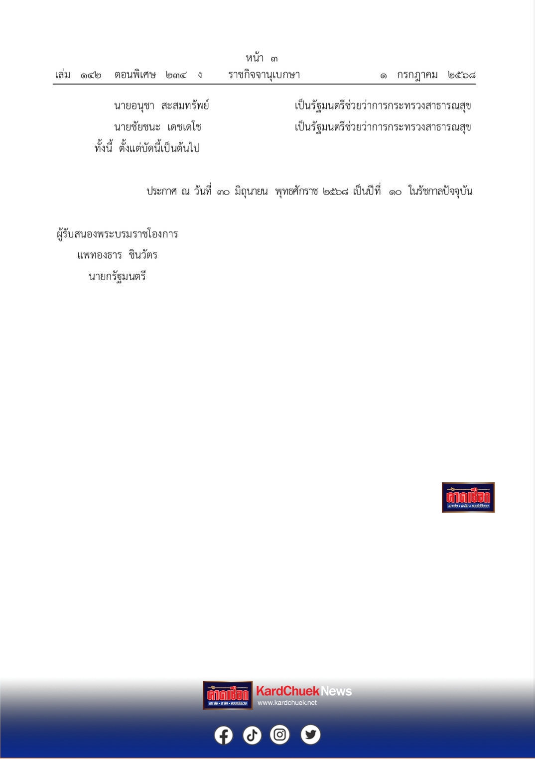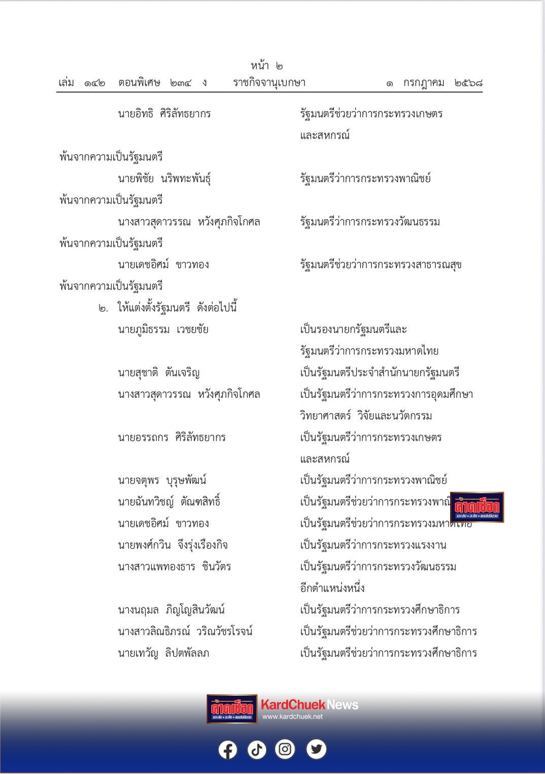 ในหลวง โปรดเกล้า ครม.ชุดใหม่แล้ว โดยมีรายชื่อ ผู้เข้าเป็น รัฐมนตรีใหม่ ดังนี้ น.ส.แพทองธาร ชินวัตร นายกรัฐมนตรี ควบ รมว.วัฒนธรรม นายภูมิธรรม เวชยชัย รองนายกรัฐมนตรี และ รมว.มหาดไทย นายเดชอิศม์ ขาวทอง รมช.มหาดไทย นายอรรถกร ศิริลัทธยากร รมว.เกษตรและสหกรณ์ นางนฤมล ภิญโญสินวัฒน์ รมว.ศึกษาธิการ น.ส.ลิณธิภรณ์ วริณวัชรโรจน์ รมช.ศึกษาธิการ นายเทวัญ ลิปตพัลลภ รมช.ศึกษาธิการ นายชัยชนะ เดชเดโช รมช.สาธารณสุข นายอนุชา สะสมทรัพย์ รมช.สาธารณสุข นางสุดาวรรณ หวังศุภกิจโกศล รมว.การอุดมศึกษา วิทยาศาสตร์ วิจัย และนวัตกรรม นายจตุพร บุรุษพัฒน์ รองนายก และ รมว.พาณิชย์ นายฉันทวิชญ์ ตัณฑสิทธิ์ รมช.พาณิชย์ นายพงศ์กวิน จึงรุ่งเรืองกิจ รมว.แรงงาน นายสุชาติ ตันเจริญ รมต.ประจำสำนักนายก