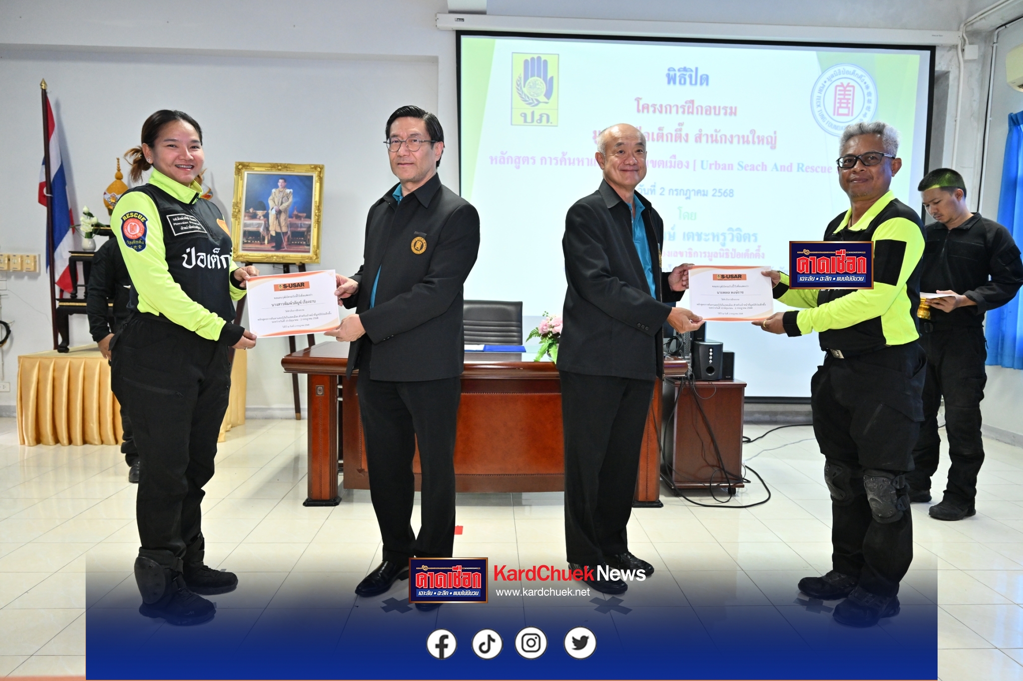 เป็นประธานมอบใบวุฒิบัตรให้แก่ทีมบรรเทาสาธารณภัย ที่สำเร็จการฝึกอบรมหลักสูตร “การค้นหาและกู้ภัยในเขตเมือง (Urban Search And Rescue) หรือ “USAR” เป็นโครงการฝึกอบรมที่มูลนิธิป่อเต็กตึ๊ง ร่วมกับ กรมป้องกันและบรรเทาสาธารณภัย กระทรวงมหาดไทย ซึ่งกำหนดจัดขึ้นระหว่างวันที่ 23 มิถุนายน – 2 กรกฎาคม พ.ศ. 2568 เพื่อฝึกทักษะ เพิ่มพูนความรู้ความสามารถ และทบทวนการปฏิบัติภารกิจการค้นหาและกู้ภัยฯ ตามหลักมาตรฐานสากล พร้อมทบทวนข้อมูลและเรียนรู้เกี่ยวกับการตรวจสอบโครงสร้างต่างๆ การพิจารณาสาเหตุรอยร้าว การตรวจสอบอาคารวิบัติ การเข้าแก้ไขเบื้องต้น ฯลฯ โดยแบ่งกลุ่มฝึกปฏิบัติเรียนรู้วิธีลดการพังทลายของโครงสร้างอาคาร การกำหนดสัญลักษณ์การค้นหา ฯลฯ รวมถึงเรียนรู้เกี่ยวกับภารกิจของสุนัขกู้ภัย (K9) โดยมี นายเกริกเสกข์สัณห์ วาสะสิริ ผู้อำนวยการส่วนปฏิบัติการพิเศษค้นหาและกู้ภัย กรมป้องกันและบรรเทาสาธารณภัย ผศ.ดร.ธเนศ วีระศิริ นายกสภาวิศวกร พร้อมทีมผู้เชี่ยวชาญฯ ร่วมเป็นวิทยากรในการฝึกอบรม พร้อมด้วยนายอรัณย์ โตทวด ผู้จัดการใหญ่มูลนิธิป่อเต็กตึ๊ง นางสาวณัฐกานต์ ขำคม ผู้จัดการฝ่ายบุคคลและฝึกอบรม และนางสาวพิมพ์ณภัท สุนทรฐิติวงษ์ ผู้จัดการฝ่ายสื่อสารองค์กร ร่วมสังเกตการณ์ ณ ศูนย์ฝึกอบรมอาสาสมัครป้องกันฝ่ายพลเรือน จังหวัดชัยนาท