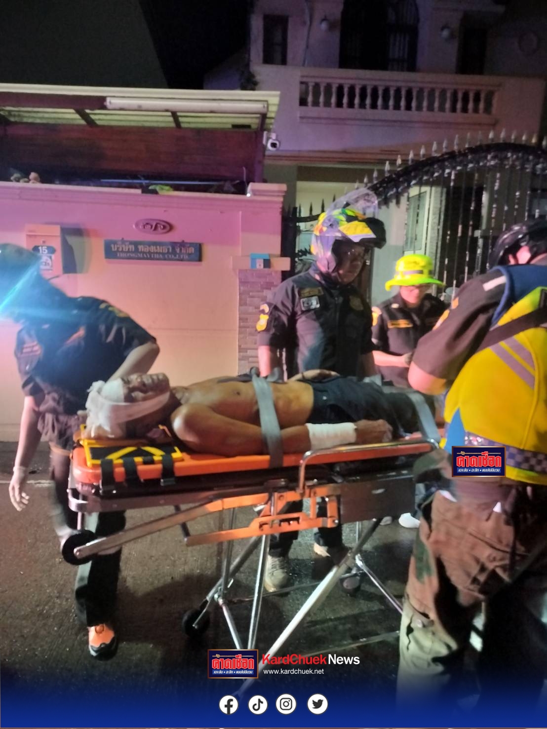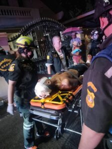 ที่เกิดเหตุพบนายสมศักดิ์ เกิดปาน อายุ 61 ปี ชาวจ.นครสวรรค์ สวมเสื้อยืดแขนสั้นสีฟ้ามีลาย ใส่กางเกงขายาวสีกรมท่า นอนจมกองเลือดอยู่หน้าบ้านเลขที่ 53/6 ถูกอาวุธมีดฟัน ที่ 1.ศีรษะ 2 แผล ความยาวประมาณ 3 นิ้ว 2.แขนขวา ความยาวประมาณ 3-4 นิ้ว 3.หัวเข่าขวา ความยาวประมาณ 1 นิ้ว 4.ข้อเท้าขวาด้านหลังบริเวณเอ็นร้อยหวาย ความยาวประมาณ 3-4 นิ้ว ประมาณการน่าจะขาด ผู้บาดเจ็บอยู่ในอาการไม่ได้สติ ถามตอบไม่ได้ เจ้าหน้าที่กู้ภัยจึงช่วยกันปฐมพยาบาลก่อนนำตัวส่งโรงพยาบาล