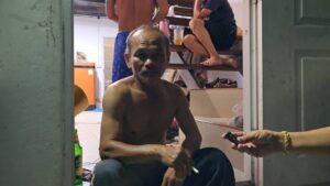 พี่สมภาร อายุ 43 ปี (เสื้อสีดำนั่งตรงบันได) เพื่อนร่วมงานของลุงคูณมี กล่าวว่า ลุงเปี๊ยกเวลาเมามีพฤติกรรมชอบแซวแฟนชาวบ้าน พูดคำหวาน ร้องเพลงแซวก็มี เมื่อก่อนตนเคยนับถือชวนมากินหมูกระทะและดื่มเบียร์ที่บ้าน แต่พอมานั่งดื่มได้ที่กลับมาแซวและหยอกล้อแฟนของตน มีเอามือมาจับมาแตะ แฟนตนก็ไม่พอใจ เคยโดนแฟนตนกระทืบด้วย ส่วนเรื่องวันนี้ตนได้ยินว่าลุงเปี๊ยกพูดจาแซวแรงใส่แฟนของนายคิม และเอาไม้ขว้างใส่ก่อนจะวิ่งไปมีเรื่องกันข้างนอก ซึ่งปกตินายคิมไม่ได้พักอยู่ที่นี่แต่จะมากินเหล้าด้วยกันบ่อย วันนี้ขับขี่รถจยย.ผ่านเข้ามา ทราบว่าลุงเปี๊ยกดักรอและเอาไม้ขว้างจึงมีเรื่อง