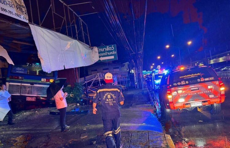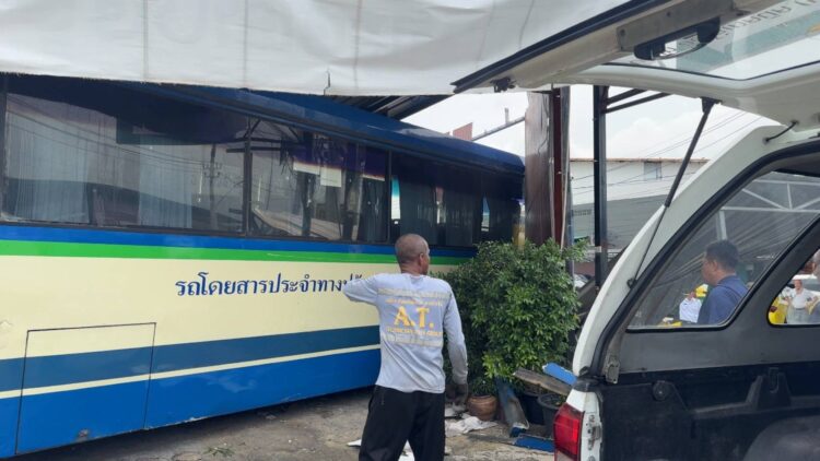 จากกรณีเมื่อเวลา 05.00 น. วันที่ 16 ก.ค. 2568 เจ้าหน้าที่ตำรวจ สภ.บางบัวทอง รับแจ้งเหตุรถโดยสารประจำทางปรับอากาศสาย 166 ทะเบียน 12-2826 กรุงเทพมหานคร เสียหลักพุ่งเข้าอู่รถแท็กซี่ หลังหักหลบรถเมล์อีกคันสีครีมแดงที่กำลังตีวงเลี้ยวกลับรถ บริเวณจุดกลับรถโรงหมี่ ถนนบางกรวย–ไทรน้อย ต.บางบัวทอง อ.บางบัวทอง จ.นนทบุรี ทำให้รถแท็กซี่เสียหาย 4 คัน และร้านรักษาสัตว์ที่อยู่ติดกันได้รับความเสียหายบางส่วน มีผู้ได้รับบาดเจ็บ 2 ราย คือ นายมนพันธ์ อายุ 27 ปี คนขับรถเมล์ และ น.ส.ธนภรณ์ สุนทรพุกก์ อายุ 28 ปี พนักงานเก็บค่าโดยสาร เจ้าหน้าที่กู้ภัยป่อเต็กตึ๊งเข้าช่วยเหลือและนำส่งโรงพยาบาลบางบัวทอง