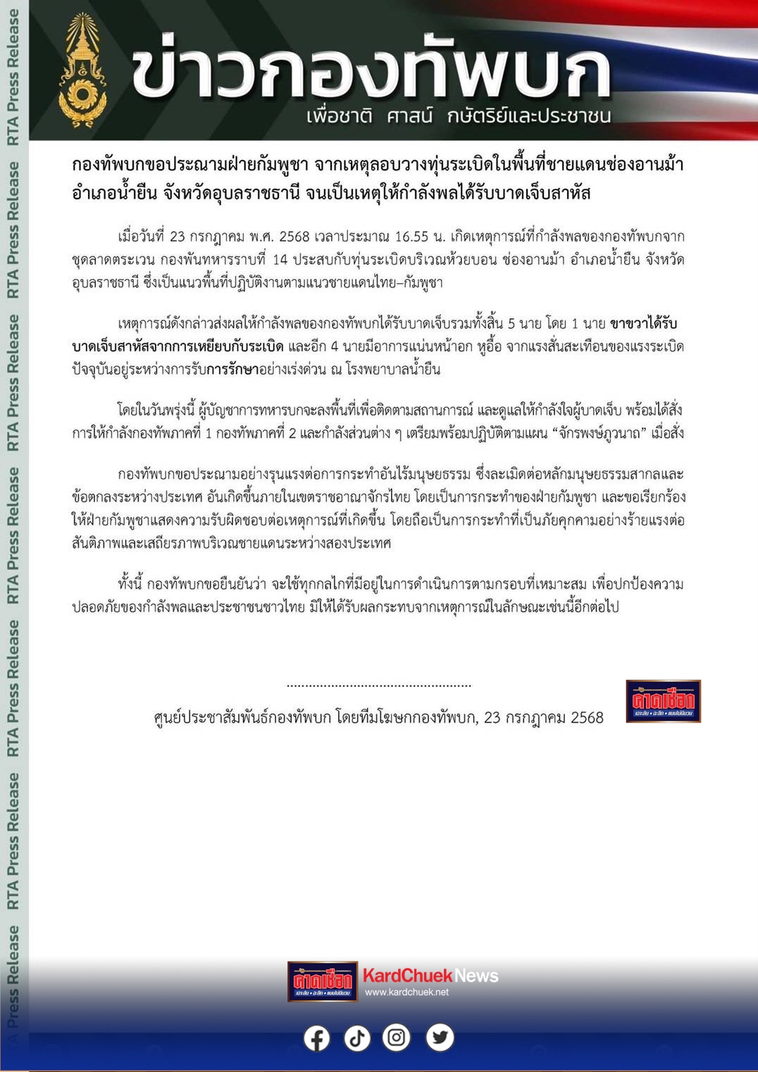 กองทัพบกขอประณามอย่างรุนแรงต่อการกระทำอันไร้มนุษยธรรม ซึ่งละเมิดต่อหลักมนุษยธรรมสากลและข้อตกลงระหว่างประเทศ อันเกิดขึ้นภายในเขตราชอาณาจักรไทย โดยเป็นการกระทำของฝ่ายกัมพูชา และขอเรียกร้องให้ฝ่ายกัมพูชาแสดงความรับผิดชอบต่อเหตุการณ์ที่เกิดขึ้น โดยถือเป็นการกระทำที่เป็นภัยคุกคามอย่างร้ายแรงต่อสันติภาพและเสถียรภาพบริเวณชายแดนระหว่างสองประเทศ