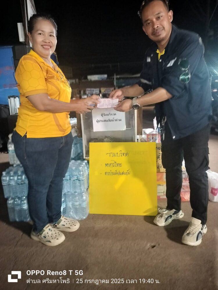 ตลอกหัวค่ำจรดช่วงกลางดึกนี้ ที่บริเวณตลาดบ้านโปร่งไผ่ ต.ท่าตูม อ.ศรีมหาโพธิ ย่านที่ตั้งชุมชนในนิคมอุตสาหกรรม 304 ที่มีโรงงานนับกว่า 1,000 แห่ง ทางอาสาสมัครมูลนิธิร่วมกตัญญูจังหวัดปราจีนบุรี มีตัวแทนรับบริจาคจากประชาชน และหนุ่มสาวโรงงานที่เลิกกะดึก เพื่อนำสิ่งของที่ได้รับบริจาคไปมอบให้กับศูนย์พักพิงผู้อพยพและเจ้าหน้าที่ทหาร ที่ดูแลคุ้มครองพลเรือนที่อพยพจังหวัดศรีสะเกษ จังหวัดสุรินทร์และพื้นที่ต่างๆ ที่ได้รับผลกระทบจากภัยสงคราม
