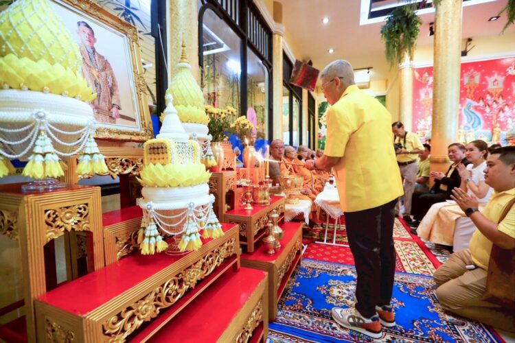 วันที่ 28 กรกฎาคม 68 ที่ร้านก๋วยเตี๋ยวลูกชิ้นปลานายเงี๊ยบ พุทธมณฑล สาย 4 อำเภอพุทธมณฑล จังหวัดนครปฐม นายสมชาติ สาลีพัฒนา เจ้าสัวเงี๊ยบ เจ้าของร้านก๋วยเตี๋ยวลูกชิ้นปลานายเงี๊ยบ เจ้าของรางวัล รางวัล Michelin Bib Gourmand 5 ปีซ้อน นิมนต์พระครูปลัดสิทธิวัฒน์ (หลวงพี่น้ำฝน) ผู้รักษาการแทนเจ้าอาวาสวัดไผ่ล้อม พระอารามหลวง จังหวัดนครปฐม พร้อมด้วยคณะสงฆ์ 9 รูป เจริญพระพุทธมนต์ รัตนปริต เนื่องในโอกาสมหามงคลเฉลิมพระชนมพรรษา พระบาทสมเด็จพระวชิรเกล้าเจ้าอยู่หัว วันที่ 28 กรกฎาคม 2568