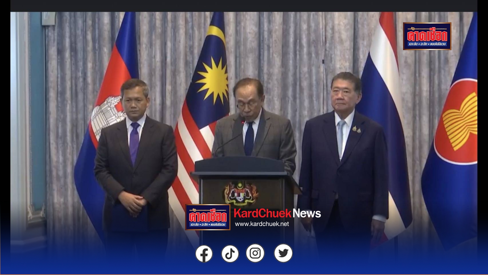 ขอขอบคุณมาเลเซียที่เป็นเจ้าภาพการประชุมในครั้งนี้ และขอขอบคุณประธานาธิบดีโดนัลด์ ทรัมป์ สำหรับการไกล่เกลี่ยอย่างเด็ดขาด ขอขอบคุณจีนสำหรับความพยายามและการมีส่วนร่วมอย่างสร้างสรรค์ และขอขอบคุณรักษาการนายกรัฐมนตรี ภูมิธรรม สำหรับการเจรจาอย่างสร้างสรรค์ที่ช่วยยุติการสู้รบและเปิดทางสู่การเจรจาทางทหาร (RBC) เวลา 7.00 น. ของวันพรุ่งนี้