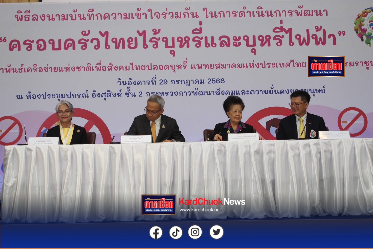 เมื่อวันที่ 29 ก.ค. 2568 ที่อาคารกรมพัฒนาสังคมและสวัสดิการ กระทระทรวงพัฒนาสังคมและความมันคงของมนุษย์ นายอนุกูล ปีดแก้ว ปลัดกระทรวงพัฒนาสังคมและความมั่นคงของมนุษย์ พร้อมด้วย ศ.เกียรติคุณ พญ.สมศรี เผ่าสวัสดิ์ ประธานสมาพันธ์เครือข่ายแห่งชาติเพื่อสังคมไทยปลอดบุหรี่, นางสาวแรมรุ้ง วรวัธ อธิบดีกรมกิจการสตรีและสถาบันครอบครัว และ ศ.เกียรติคุณ นพ.รณชัย คงสกนธ์ เลขาธิการสมาพันธ์เครือข่ายแห่งชาติเพื่อสังคมไทยปลอดบุหรี่ ร่วมกันแถลงข่าวพิธีลงนามบันทึกความเข้าใจร่วมกันในการดำเนินการพัฒนาครอบครัวไทยไร้บุหรี่และบุหรี่ไฟฟ้า