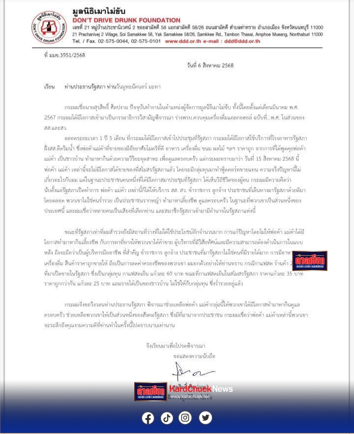 ผู้จัดการมูลนิธิเมาไม่ขับ ทำหนังสือวิงวอนประธานรัฐสภา พิจารณาช่วยเหลือพ่อค้า แม่ค้าในโรงอาหารรัฐสภา
