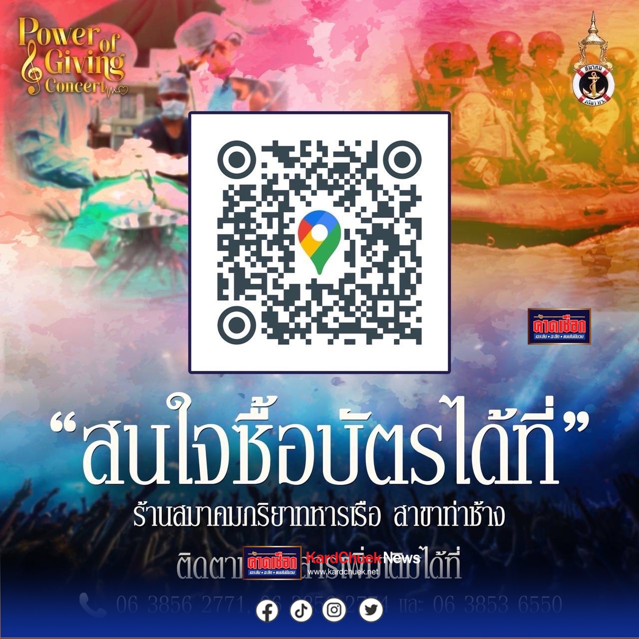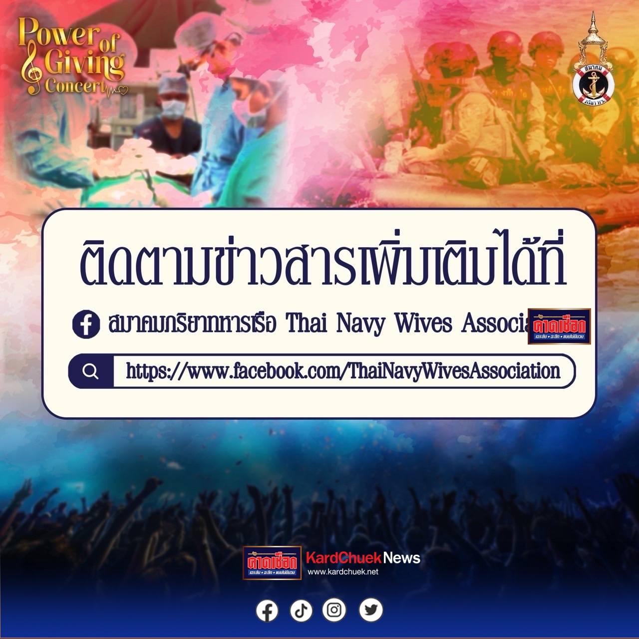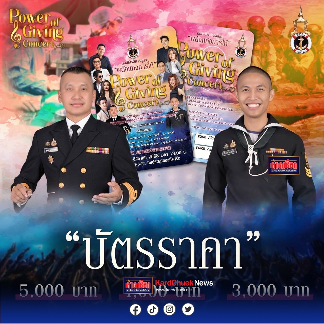สมาคมภริยาทหารเรือ ขอเชิญชม คอนเสิร์ตการกุศล “พลังแห่งการให้ Power of Giving Concert “ เพื่อจัดหาอุปกรณ์ทางการแพทย์สนับสนุนการปฏิบัติการทางทหาร บรรเลงโดย วงดุริยางค์ราชนาวี พบกับ ศิลปินรับเชิญ กบ ทรงสิทธิ์ รุ่งนพคุณศรี | ชมพู ฟรุตตี้ | นภ พรชำนิ | กัน เดอะสตาร์ | ก้อง นูโว | แก้ม เดอะสตาร์ | อุ้ย รวิวรรณ จินดา | ปั่น ไพบูลย์เกียรติ เขียวแก้ว | ตู่ นันทิดา แก้วบัวสาย กำหนดจัดแสดง ในวันเสาร์ที่ 30 สิงหาคม 2568 เวลา 18.00 น. ณ ห้องเจ้าพระยา หอประชุมกองทัพเรือ บัตรราคา 5,000 บาท / 4,000 บาท / 3,000 บาท