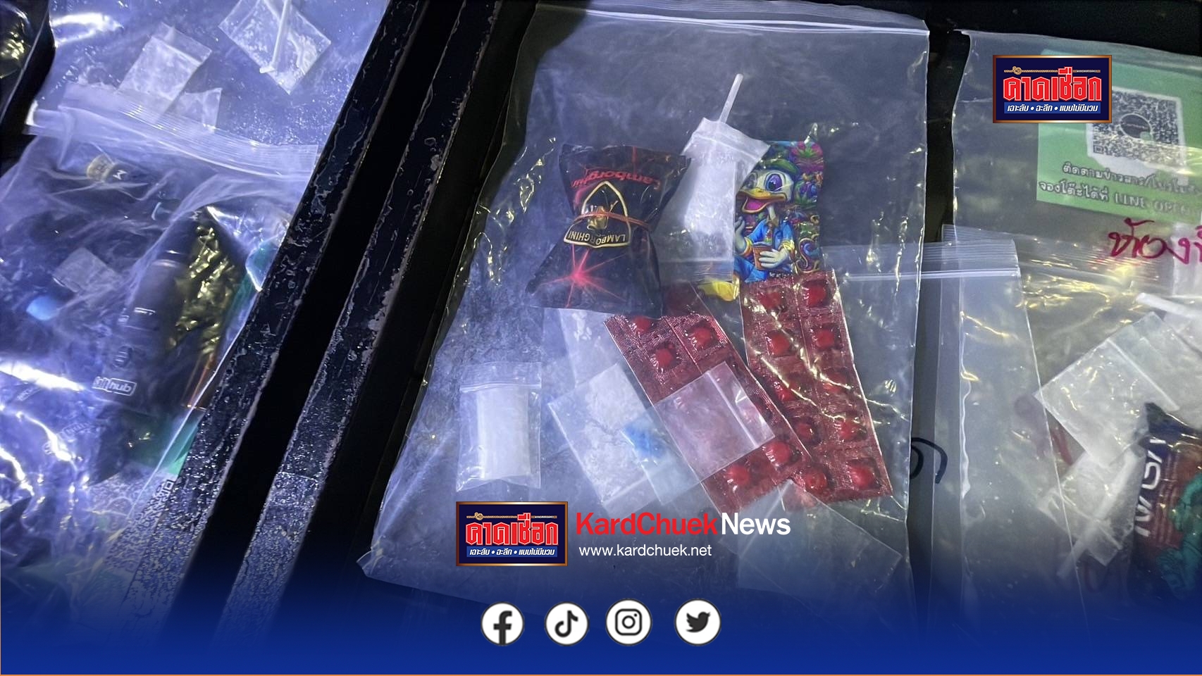 จากการตรวจสอบพบตามพื้นและใต้นั่งโฟฟาพบยาเสพติดทิ้งเกลื่อน มีทั้ง ยาเคตามิน ยาอี ยาเค ยาไอซ์ ยาบ้า ยาเสพติดจะบรรจุอยู่ในถุงพลาสติก และพอร์ดบุหรี่ไฟฟ้าจำนวนหนึ่ง เจ้าหน้าที่จึงได้เก็บรวบรวมไว้เป็นหลักฐาน