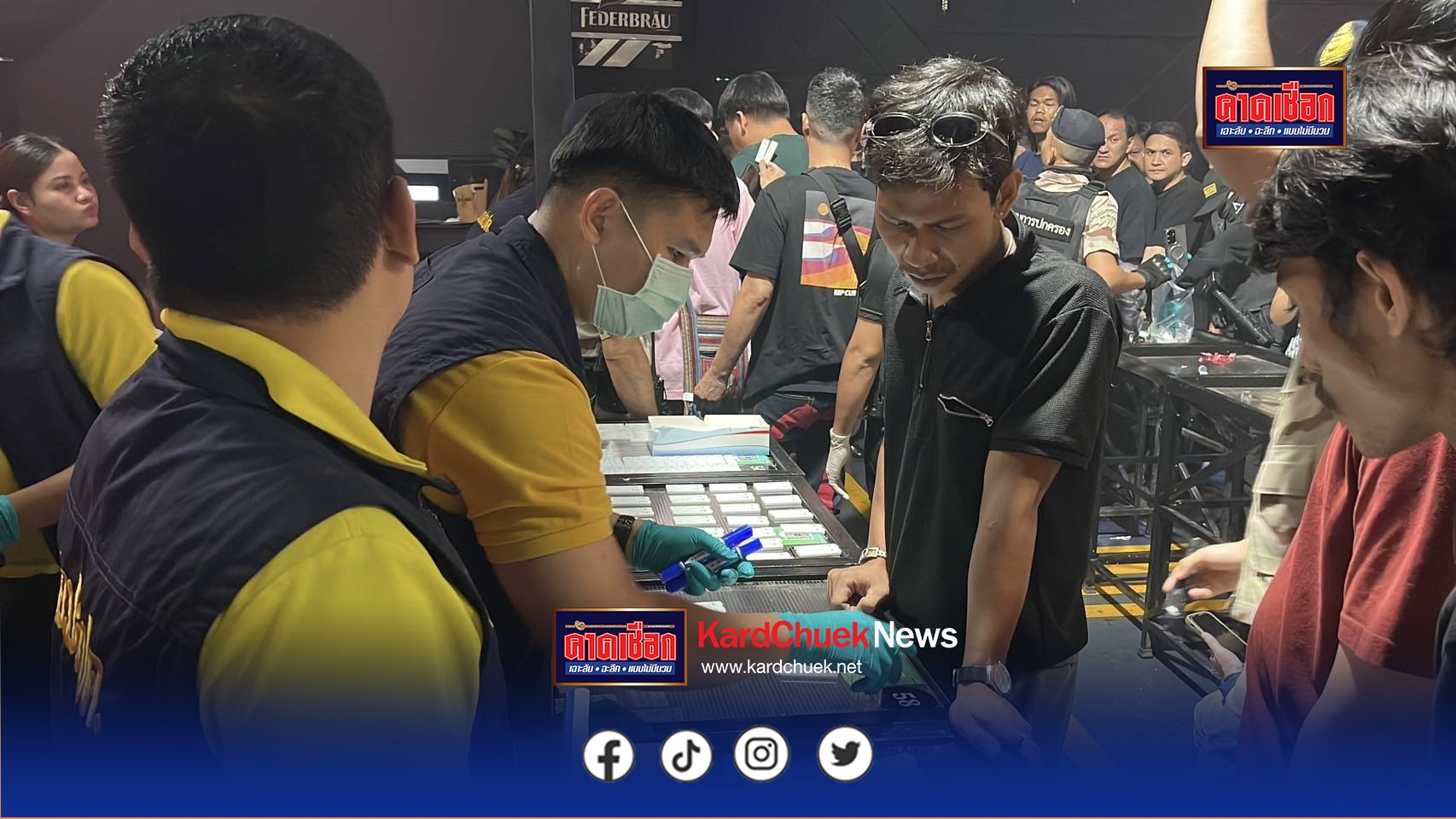 สำหรับผับแห่งนี้เปิดมาได้ระยะหนี่งแล้ว มีเฟสบุ๊กชื่อ สกิน ผับ ที่เราประเมินไว้มีนักเที่ยวประมาณ 300-400 คน แต่วันนี้มีนักเที่ยวเข้ามาเที่ยวจำนวนมาก ตอนนี้ก็ตรวจพบแล้วปัสาสวะเป็นสีม่วงแล้ว 175 คน เป็นชาย 91 คน หญิง 84 คน ซึ่งทั้งหมดจะถูกส่งตัวไปดำเนินคดีและบำบัดรักษาตามกระบวนการของกฎหมายต่อไป