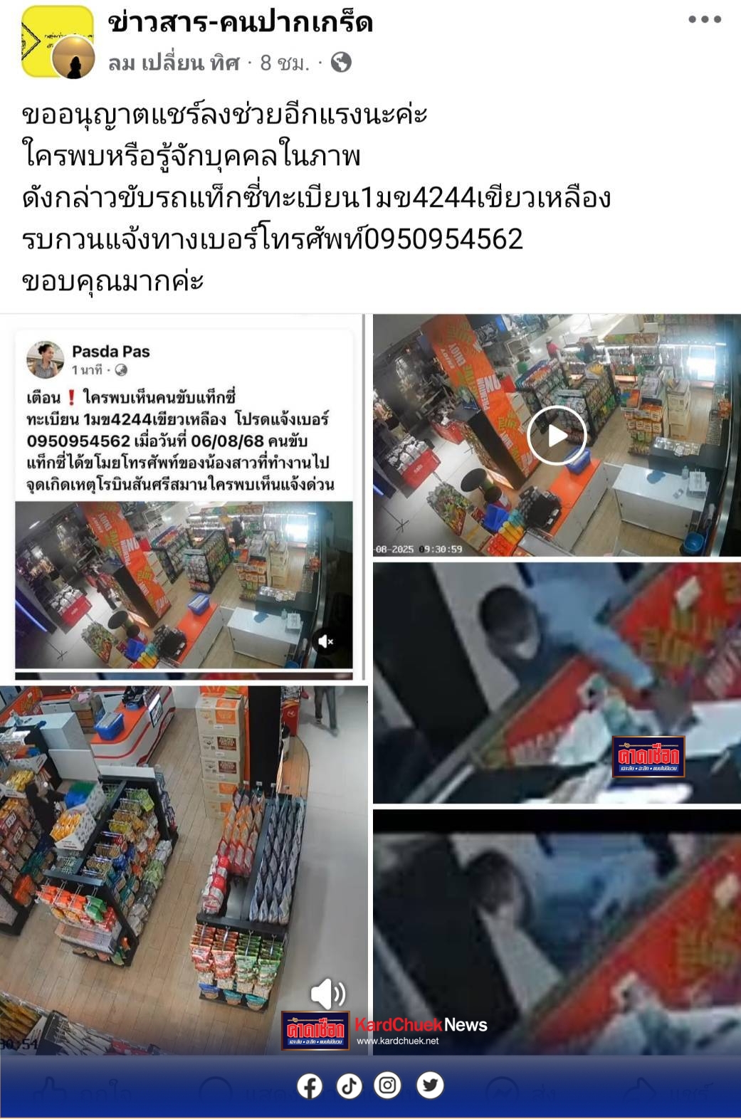 จากกรณีผู้ใช้เฟซบุ๊กรายหนึ่งโพสต์ภาพจากกล้องวงจรปิด ขณะคนร้ายซึ่งเป็นคนขับแท็กซี่ ก่อเหตุขโมยโทรศัพท์มือถือภายในร้านถั่วแห่งหนึ่งในศูนย์การค้าชื่อดังย่านปากเกร็ด พร้อมข้อความขอให้ช่วยแชร์เพื่อตามหาตัวคนร้าย ระบุว่าขับรถแท็กซี่สีเขียว-เหลือง ทะเบียน 1มข 4244 และฝากผู้พบเห็นแจ้งเบาะแสที่เบอร์ 095-095-4562
