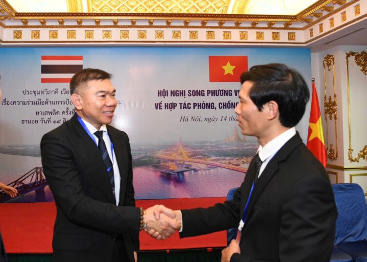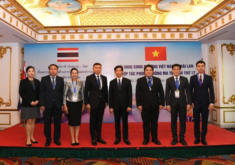 เมื่อวันพฤหัสบดีที่ 14 สิงหาคม 2568 พลตำรวจโท ภาณุรัตน์ หลักบุญ เลขาธิการสำนักงาน ป.ป.ส. นำคณะผู้แทนไทยเข้าร่วมการประชุมทวิภาคีไทย – เวียดนาม ว่าด้วยความร่วมมือด้านการป้องกันและปราบปรามยาเสพติด ครั้งที่ 17 ณ กรุงฮานอย สาธารณรัฐสังคมนิยมเวียดนาม โดยมี พลตำรวจตรี โง แทง บิ่ญ (Pol.Maj.Gen. Ngo Thanh Binh) อธิบดีกรมตำรวจปราบปรามยาเสพติดเวียดนาม (The Counter Narcotics Police Department of Vietnam: CND) เป็นประธานการประชุมและหัวหน้าคณะผู้แทนฝ่ายเวียดนาม