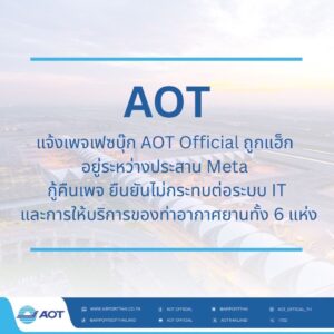 AOT จึงได้ดำเนินการประสานงานกับผู้ให้บริการ Facebook บริษัท Meta Platforms เพื่อเข้าสู่กระบวนการกู้คืน โดยทาง Meta Platforms ได้รับเรื่องและอยู่ระหว่างดำเนินการแก้ไขเหตุการณ์ดังกล่าวโดยเร่งด่วน ทั้งนี้ เหตุการณ์ดังกล่าวไม่มีผลกระทบต่อระบบสารสนเทศและการให้บริการของท่าอากาศยานทั้ง 6 แห่งของ AOT แต่อย่างใด โดยยังคงให้บริการได้ตามปกติทุกท่าอากาศยาน