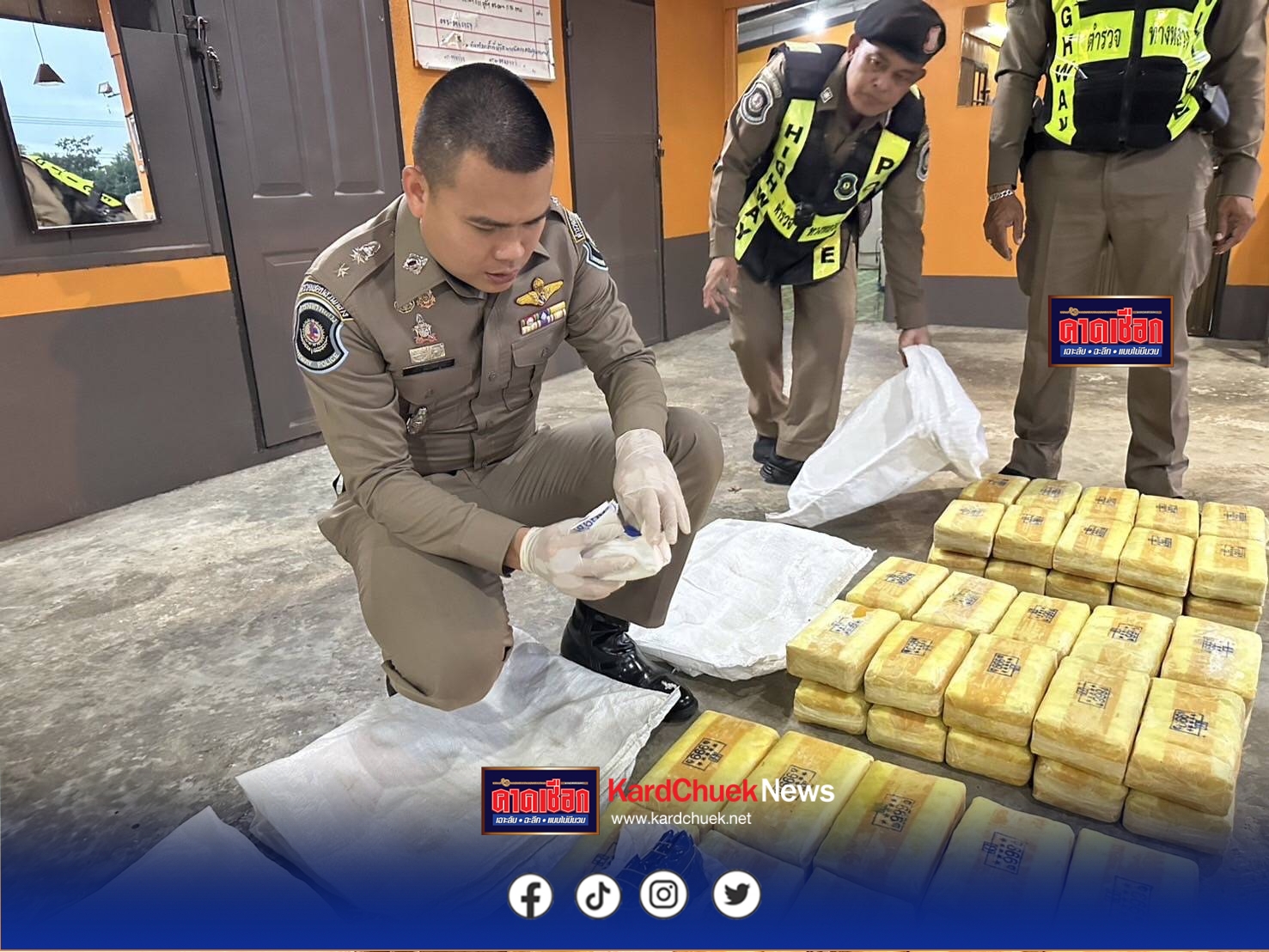 เจ้าหน้าที่ชุดจับกุม นำโดย พ.ต.ท.กล้า สมบัติพิบูลย์ สว.ส.ทล.4 กก.2 บก.ทล., ร.ต.อ.ชรัณ ปาณะศรี รอง สว.ส.ทล.4 กก.2 บก.ทล., ร.ต.อ.วิมล แก้วชู, ด.ต.ธนพนธ์ เกิดเขาทะลุ ผบ.หมู่ ส.ทล.4 กก.2 บก.ทล.