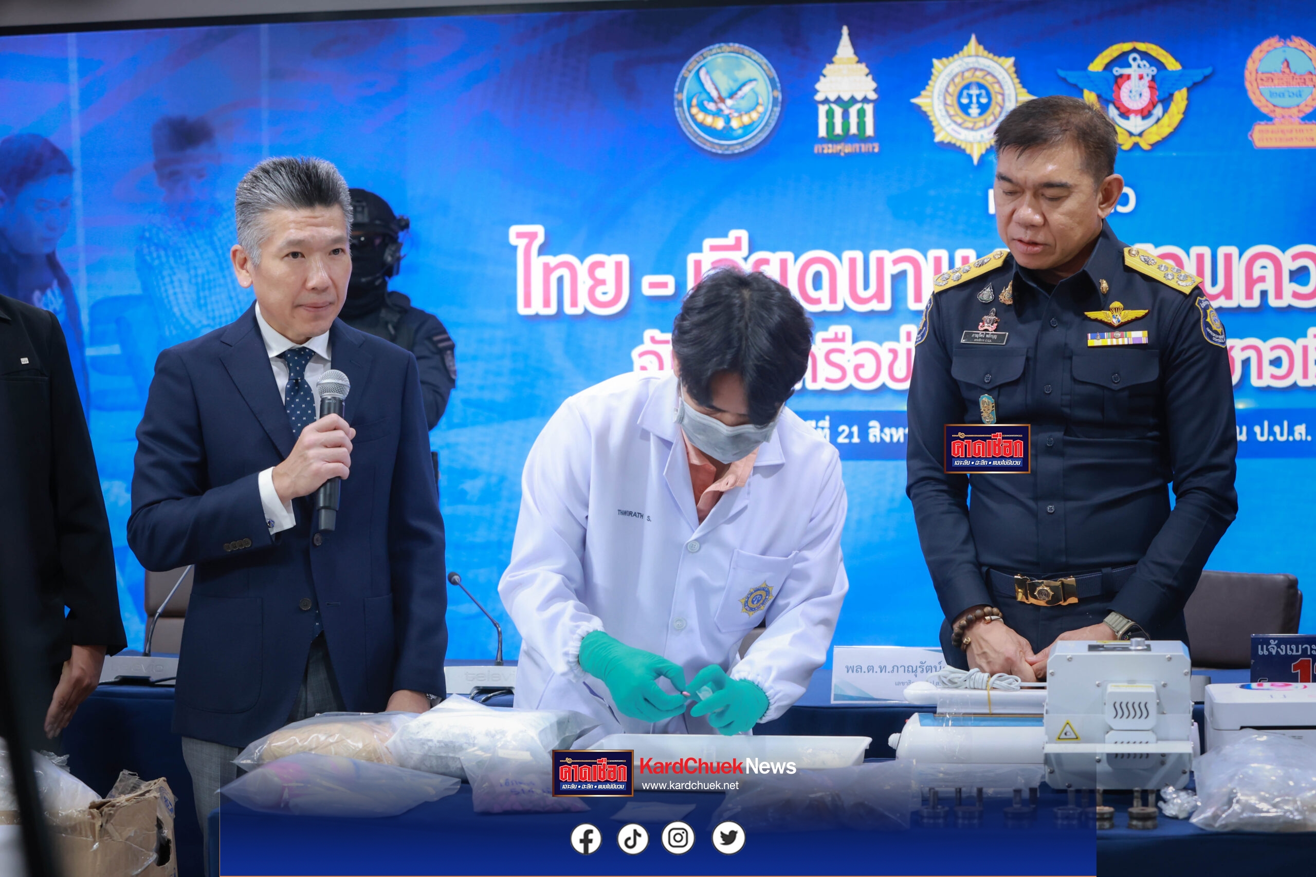 วันพฤหัสบดีที่ 21 สิงหาคม 2568 พล.ต.ท.ภาณุรัตน์ หลักบุญ เลขาธิการ ป.ป.ส. พร้อมด้วย นายปฤณ เมฆานันท์ ผู้อำนวยการสำนักปราบปรามยาเสพติด สำนักงาน ป.ป.ส., พ.อ.ฤทธิรงค์ ตุ้มทอง (หน.หน่วยปฏิบัติการข่าวสนับสนุน ทภ.1 สน.322 สปก.ฝขว.ศปก.ทบ.), นายวราสิทธิ์ เมืองคุ้ม ผู้เชี่ยวชาญด้านเทคนิคการตรวจสอบสินค้า กรมศุลกากร และ นายโกสินทร์ ไตรนิคม ผู้ช่วยผู้จัดการฝ่ายจัดระบบปฏิบัติการไปรษณีย์ บริษัท ไปรษณีย์ไทย จำกัด แถลงผลการจับกุมเครือข่ายยาเสพติดชาวเวียดนาม จำนวน 4 คน ของกลาง คีตามีน 5.2 กก. เอ็กซ์ตาซี (ยาอี) 514 เม็ด ผงยาอี เครื่องตอกอัดเม็ดอัตโนมัติ แบบ single punch พร้อมหัวตอกยาอี logo ต่าง ๆ และอุปกรณ์อัดเม็ดยาจำนวนหลายรายการ เหตุเกิดที่ คอนโดมีเนียมย่านรามคำแหง ต่อเนื่อง บ้านเช่าย่านลาดพร้าว กทม.
