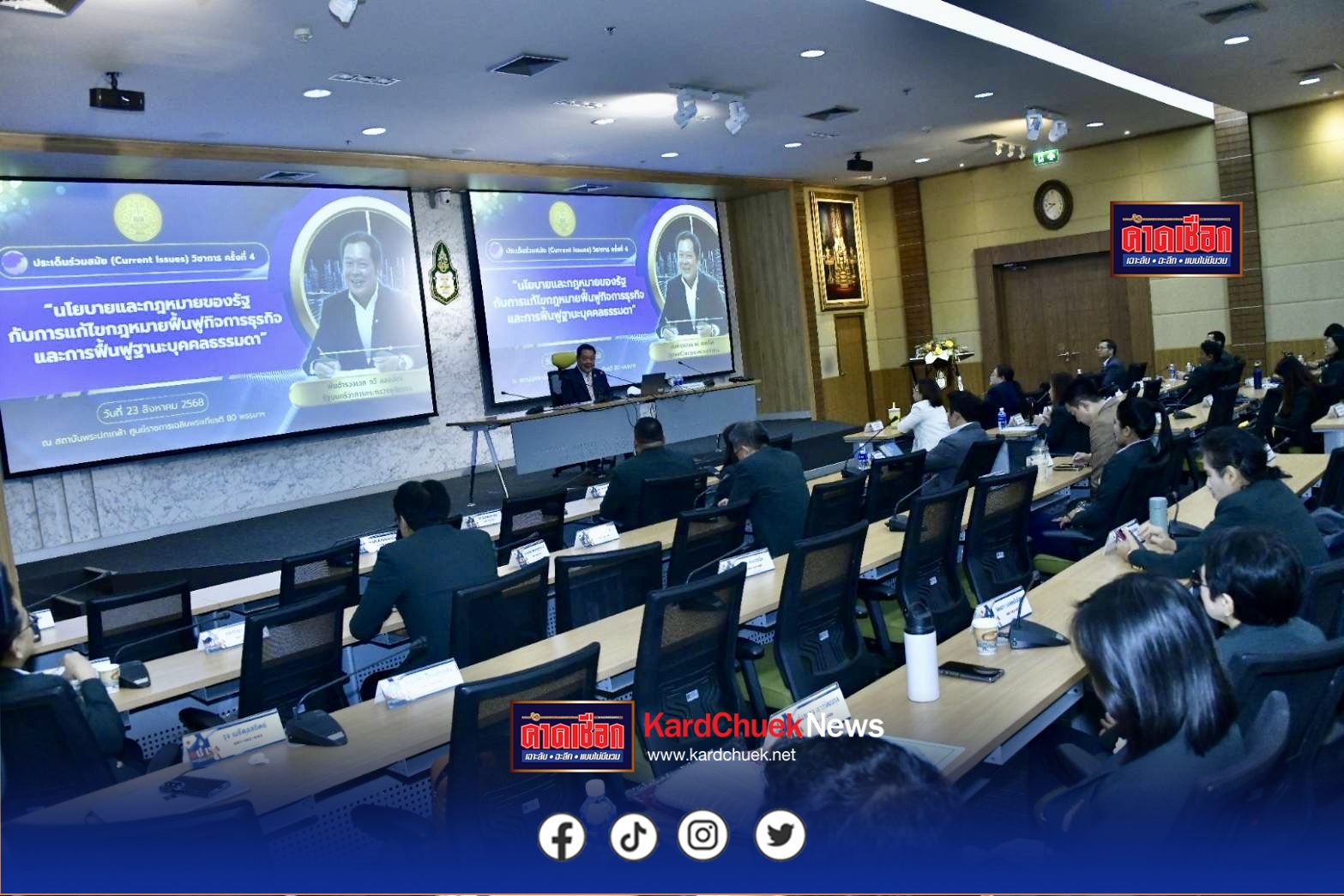 กรุงเทพฯ – วันนี้ (23 สิงหาคม 2568) พันตำรวจเอกทวี สอดส่อง รัฐมนตรีว่าการกระทรวงยุติธรรม และประธานคณะกรรมาธิการวิสามัญพิจารณาร่างพระราชบัญญัติล้มละลาย (ฉบับที่) พ.ศ. … ได้เข้าร่วมและกล่าวปาฐกถาพิเศษในการสัมมนาประเด็นร่วมสมัยวิชาการ ครั้งที่ 4 ในหัวข้อ “นโยบายและกฎหมายของรัฐกับการแก้ไขกฎหมายฟื้นฟูกิจการธุรกิจและการฟื้นฟูฐานะบุคคลธรรมดา” ของสถาบันพระปกเกล้า โดยย้ำถึงความสำคัญของการปฏิรูปกฎหมายล้มละลายครั้งใหญ่ เพื่อเป็นเครื่องมือในการแก้ไขวิกฤตหนี้สินของชาติ และเปิดโอกาสให้ผู้ประสบปัญหาทั้งภาคธุรกิจและประชาชนได้กลับมาเริ่มต้นใหม่อย่างมีศักดิ์ศรี