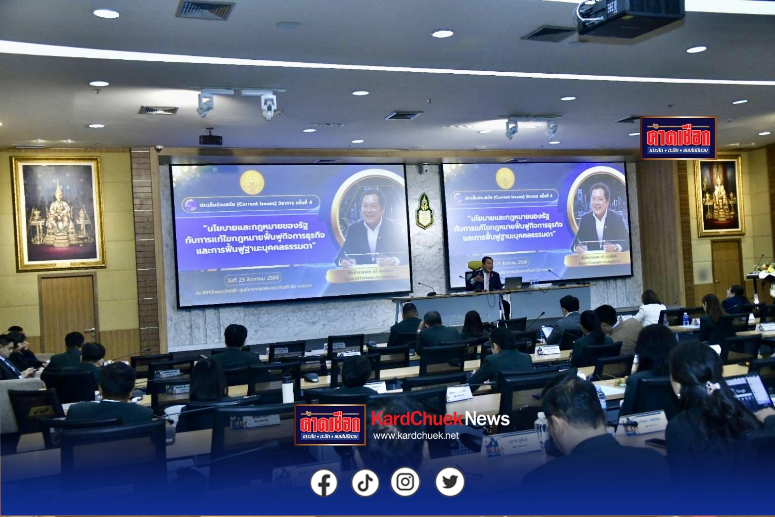 พันตำรวจเอกทวี สอดส่อง รัฐมนตรีว่าการกระทรวงยุติธรรม เปิดเผยว่า สถานการณ์หนี้สินของไทยอยู่ในระดับที่น่าเป็นห่วง โดยมีหนี้สินในระบบบังคับคดีรวมกว่า 18 ล้านล้านบาท และเมื่อรวมกับคดีล้มละลายที่มีมูลค่าหนี้กว่า 7.8 ล้านล้านบาท จะทำให้ยอดหนี้ในระบบยุติธรรมสูงถึง 25 ล้านล้านบาท หรือประมาณ 8 เท่าของงบประมาณประจำปีของประเทศ ซึ่งตัวเลขเหล่านี้สะท้อนถึงความทุกข์และความเปราะบางทางเศรษฐกิจและสังคมที่ต้องได้รับการแก้ไขอย่างเร่งด่วน การสัมมนาครั้งนี้เกิดขึ้นในช่วงเวลาที่เหมาะสมอย่างยิ่ง เนื่องจากร่าง พ.ร.บ. ล้มละลายฯ ได้ผ่านการพิจารณาของคณะกรรมาธิการฯ ถึง 23 ครั้ง และกำลังจะเข้าสู่การพิจารณาในวาระที่ 3 ของสภาผู้แทนราษฎรในวันที่ 3 กันยายนนี้