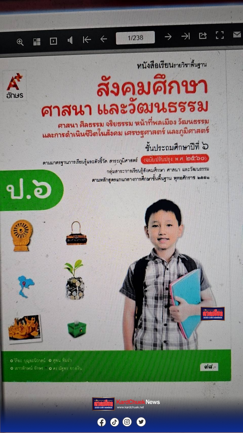 ผู้สื่อข่าวรายงานความคืบหน้าว่า ก่อนหน้านี้ ได้พบในการเรียนขั้นพื้นฐานตามมาตรฐานการเรียนรู้และตัวชี้วัด (ฉบับปรับปรุง พ.ศ. 2560) ตามหลักสูตรแกนกลางการศึกษาขั้นพื้นฐาน พุทธศักราช 2551 กระทรวงศึกษาธิการ พบมีสื่อการเรียนการสอนเป็นหนังสือแบบเรียนรายวิชาพื้นฐานสังคมศึกษาศาสนาและวัฒนธรรม ศาสนา ศีลธรรม จริยธรรม หน้าที่พลเมือง วัฒนธรรม และการดำเนินชีวิตในสังคม เศรษฐศาสตร์ และภูมิศาสตร์ ระดับชั้นประถมศึกษาปีที่ 6 (ช่วงชั้นที่2) ของสำนักพิมพ์แห่งหนึ่ง