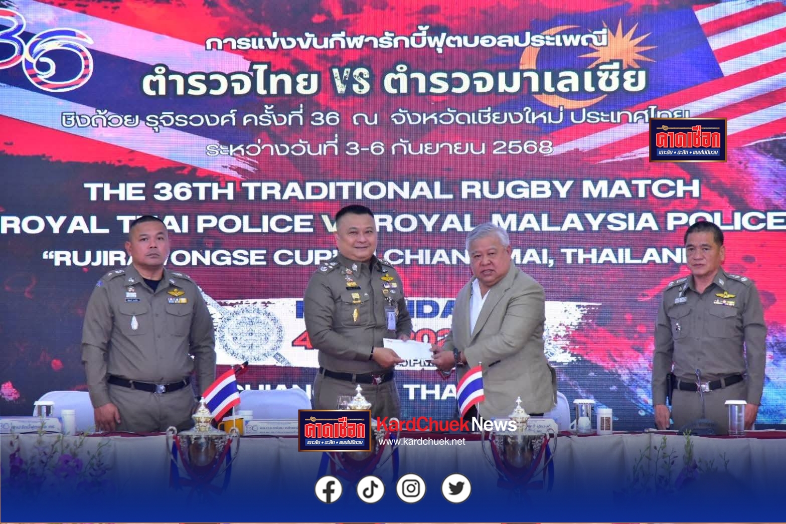 พล.ต.อ.กิตติ์รัฐ พันธุ์เพ็ชร์ ผู้บัญชาการตำรวจแห่งชาติ มอบหมาย พล.ต.อ.กรไชย คล้ายคลึง รองผู้บัญชาการตำรวจแห่งชาติ ในฐานะประธานคณะทำงานการจัดการแข่งขันกีฬารักบี้ฟุตบอลประเพณีระหว่างตำรวจไทยและตำรวจมาเลเซีย พร้อมด้วย มูฮัมหมัด ฮาฟิซ อาบู บาการ์ เลขานุการเอก/ผู้ช่วยทูตตำรวจ ประจำสถานเอกอัครราชทูตมาเลเซีย ประจำประเทศไทย และ พล.ต.ต.เทอดศักดิ์ รุจิรวงศ์ ที่ปรึกษาคณะทำงานฯ แถลงข่าวการแข่งขันกีฬารักบี้ฟุตบอลประเพณีระหว่างตำรวจไทยและตำรวจมาเลเซีย ชิงถ้วยรุจิรวงศ์ ครั้งที่ 36 ประจำปี 2568 ณ ห้องสารสิน อาคาร 1 สำนักงานตำรวจแห่งชาติ เมื่อวันที่ 29 สิงหาคม 2568