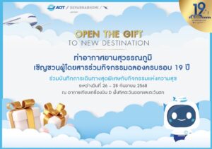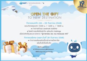 ท่าอากาศยานสุวรรณภูมิ (ทสภ.) ขอเชิญชวนผู้โดยสารร่วมกิจกรรมพิเศษในโอกาสครบรอบการดำเนินงาน 19 ปี ภายใต้สโลแกน “19 ปี ท่าอากาศยานสุวรรณภูมิ ดูแลทุกการเดินทางอย่างใส่ใจ พร้อมก้าวต่อไปอย่างยั่งยืน” ซึ่งจัดขึ้นระหว่างวันที่ 26–28 กันยายน 2568 ณ อาคารเทียบเครื่องบิน D ทสภ. ไฮไลท์ภายในงานประกอบด้วย จุดถ่ายภาพแลนด์มาร์คพิเศษ “กล่องของขวัญโฮโลแกรมขนาดใหญ่ พร้อมชวนเล่นเกมส์สนุกสนาน ลุ้นรับของที่ระลึกจากกาชาปอง