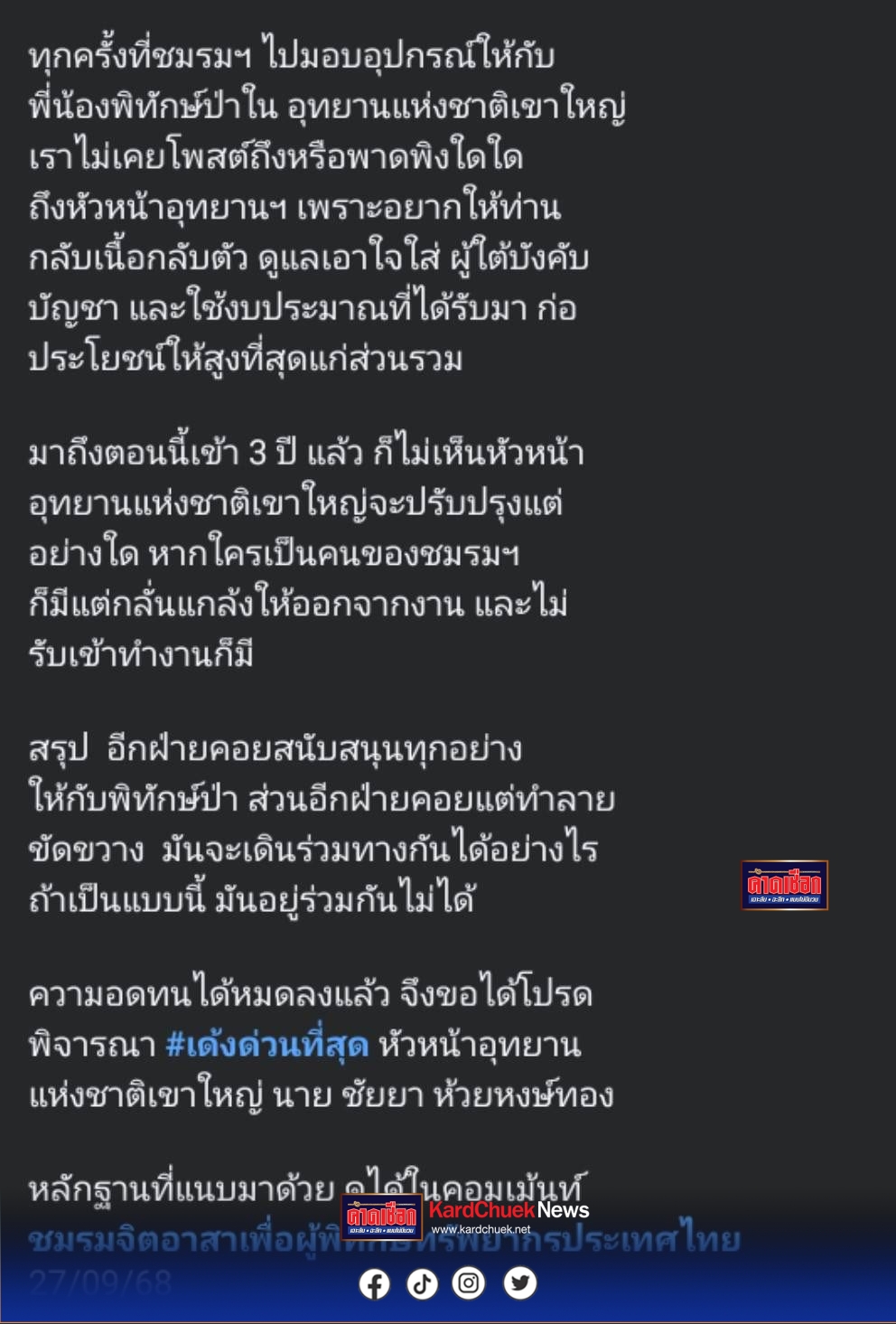 เมื่อเวลา13.10น.วันนี้1ต.ค. 68ผู้สื่อข่าวรายงานว่า ได้รับแจ้งจากนายชัยยา ห้วยหงษ์ทอง หัวหน้าอุทยานแห่งชาติเขาใหญ่มรดกโลก (ในพื้นที่รอยต่อ4จังหวัด จ.ปราจีนบุรี จ.นครนายก จ.สระบุรี และ จ นครราชสีมา) เมื่อวันที่ 26 กันยายน 2568ที่ผ่านมาพบ เฟซบุ๊กเพจ “ชมรมจิตอาสาเพื่อผู้พิทักษ์ทรัพยากรประเทศไทย” โดยบัญชีชื่อ “มาเพื่อเซฟเรนเจอร์” ได้โพสต์ข้อความกล่าวหา นายภัทรพล ซุ้นฮั้ว และ ตน (หัวหน้าอุทยานแห่งชาติเขาใหญ่ ) พร้อมคลิปวิดีโอสัมภาษณ์เจ้าหน้าที่พิทักษ์ป่า