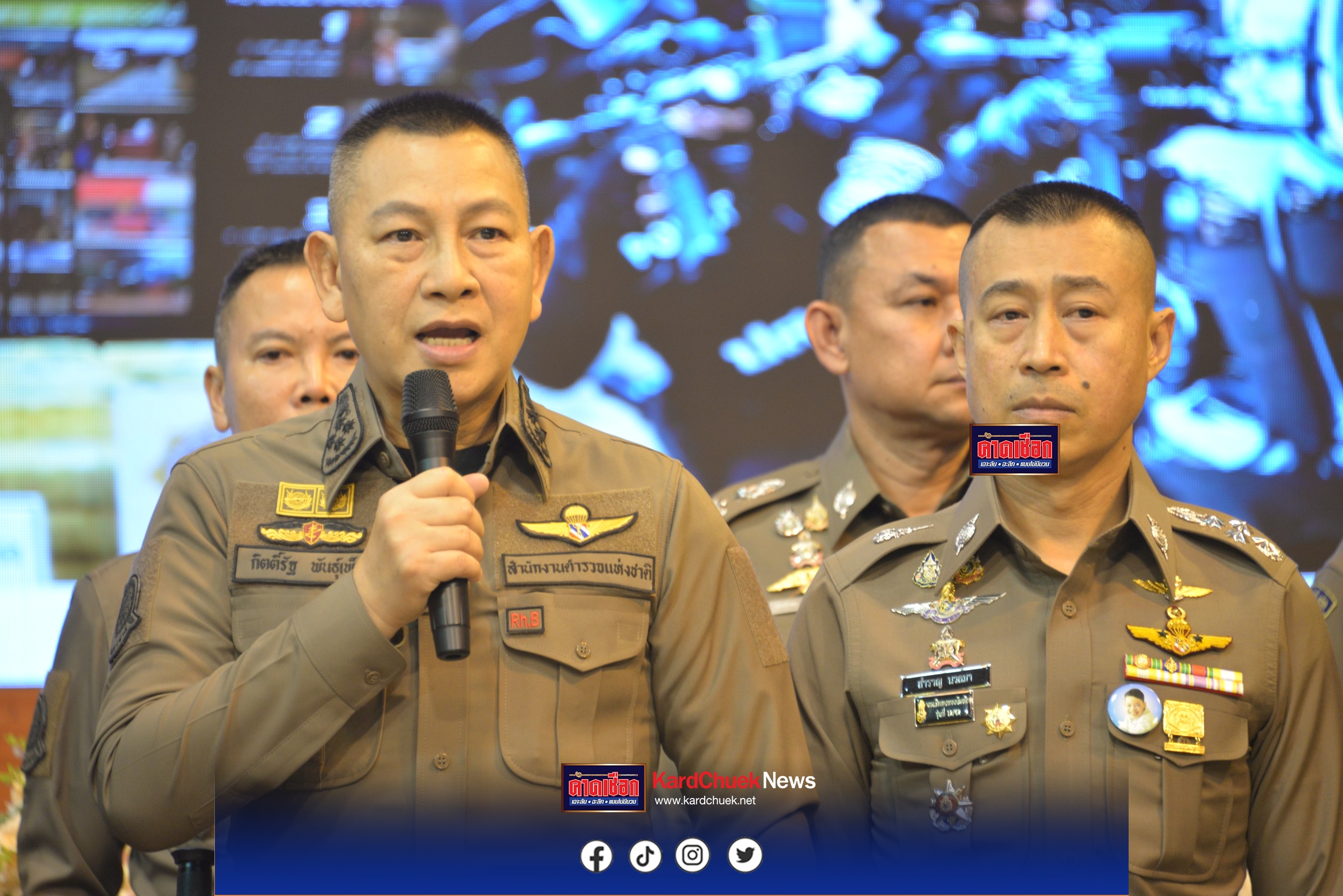 ผบช.น., พล.ต.ท.รุ่งโรจน์ฐากูรปุณยสิริ ผบช.ตชด., พลโท ณัฐศิษฐ์คงชินศาสตร์ธิต ผอ.ศปป.2 กอ.รมน., พ.อ.เกียรติศักดิ์ทรัพย์เมฆ รอง ผบ.ขกท. และเจ้าหน้าที่ที่เกี่ยวข้อง เข้าร่วมการแถลงผลงานดังกล่าว