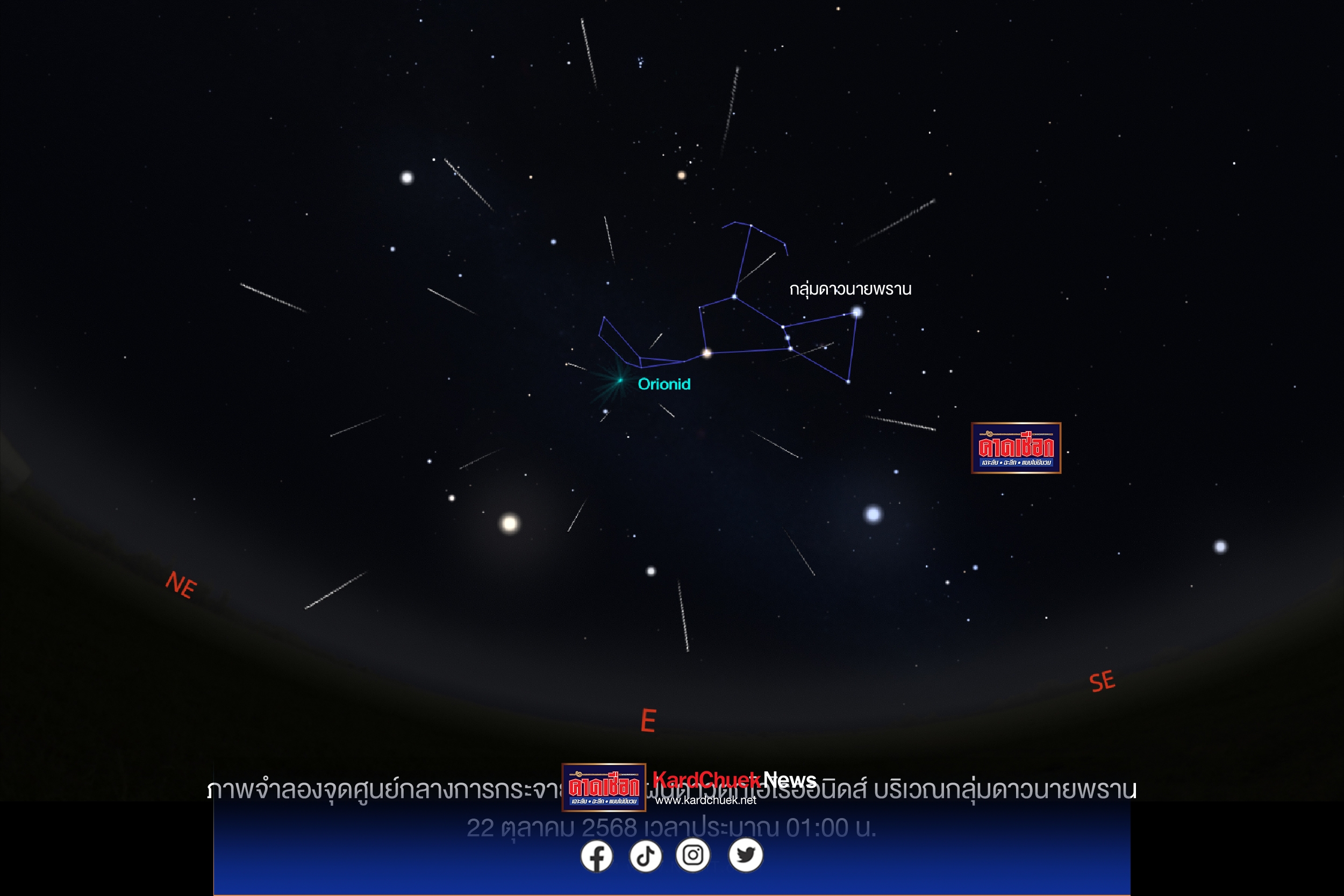 นายศุภฤกษ์ คฤหานนท์ ผู้ช่วยผู้อำนวยการสถาบันวิจัยดาราศาสตร์แห่งชาติ เปิดเผยว่า “ฝนดาวตกโอไรออนิดส์” หรือฝนดาวตกในกลุ่มดาวนายพราน จะเกิดขึ้นในช่วงวันที่ 2 ตุลาคม ถึง 7 พฤศจิกายน ของทุกปี สำหรับในปี 2568 คาดว่ามีอัตราการตกสูงสุดเฉลี่ยประมาณ 20 ดวงต่อชั่วโมง ในคืน 21 ต่อเนื่องถึงรุ่งเช้า 22 ตุลาคม 2568 เริ่มสังเกตการณ์ได้ตั้งแต่เวลาประมาณ 22.30 น. ของวันที่ 21 ตุลาคม โดยจุดศูนย์กลางการกระจายตัวของฝนดาวตกจะอยู่บริเวณแขนของกลุ่มดาวนายพราน ปรากฏขึ้นทางทิศตะวันออก จากนั้นจะค่อย ๆ เคลื่อนสูงขึ้นสู่บริเวณกลางท้องฟ้า และสามารถเฝ้าชมได้ตลอดทั้งคืนจนถึงรุ่งเช้า