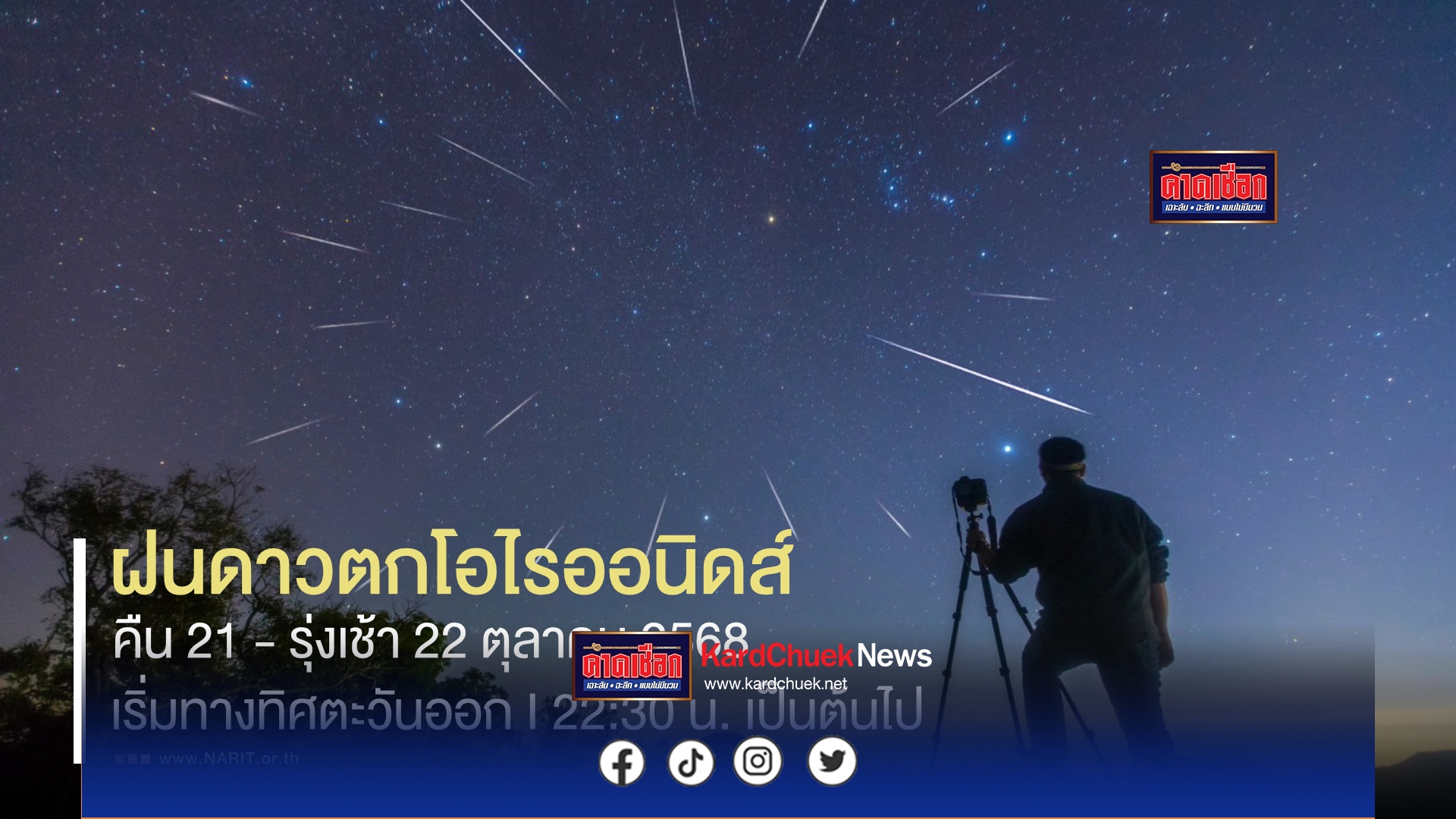 ผู้สื่อข่าว จ.ปราจีนบุรี ได้รับแจ้งจากงานประชาสัมพันธ์และสื่อสารองค์กรสถาบันวิจัยดาราศาสตร์แห่งชาติ (องค์การมหาชน) (NARIT) กระทรวงการอุดมศึกษา วิทยาศาสตร์ วิจัย และนวัตกรรม (อว.) เผยมีปรากฏการณ์ “ฝนดาวตกโอไรออนิดส์” คืน 21 ต.ค. 68 ตั้งแต่ 22.30 น. จนถึงรุ่งเช้าอีกวัน ปีนี้ไร้แสงจันทร์รบกวน หากฟ้าใสไร้ฝน ลุ้นชมด้วยตาเปล่าได้ทั่วประเทศ
