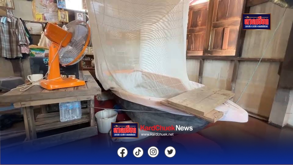 ที่บ้านของ นาย ประสิทธิ์ กิจนิยม อายุ 78 ปี อาชีพช่างตัดผม บ้านถูกน้ำท่วมถึงชั้น 2 ของตัวบ้านแล้ว อาศัยอยู่กับน้องชาย น้ำท่วมสูงจนถึงบ้าน ซึ่งบ้านเป็นใต้ถุนสูง อาชีพเดียวที่เลี้ยงตัวก็ไม่สามารถประกอบอาชีพได้ ต้องนำเรือไฟเบอร์มาทำที่นอนเตรียมเอาไว้ เพราะน้ำท่วมสูงกว่านี้คงไม่ที่นอนต้องนอนในเรือ ข้าวของคงต้องยอมเสียหายหนุนเอาไว้แล้ว ขอให้ที่นอนที่อยู่ในบ้านได้พอ