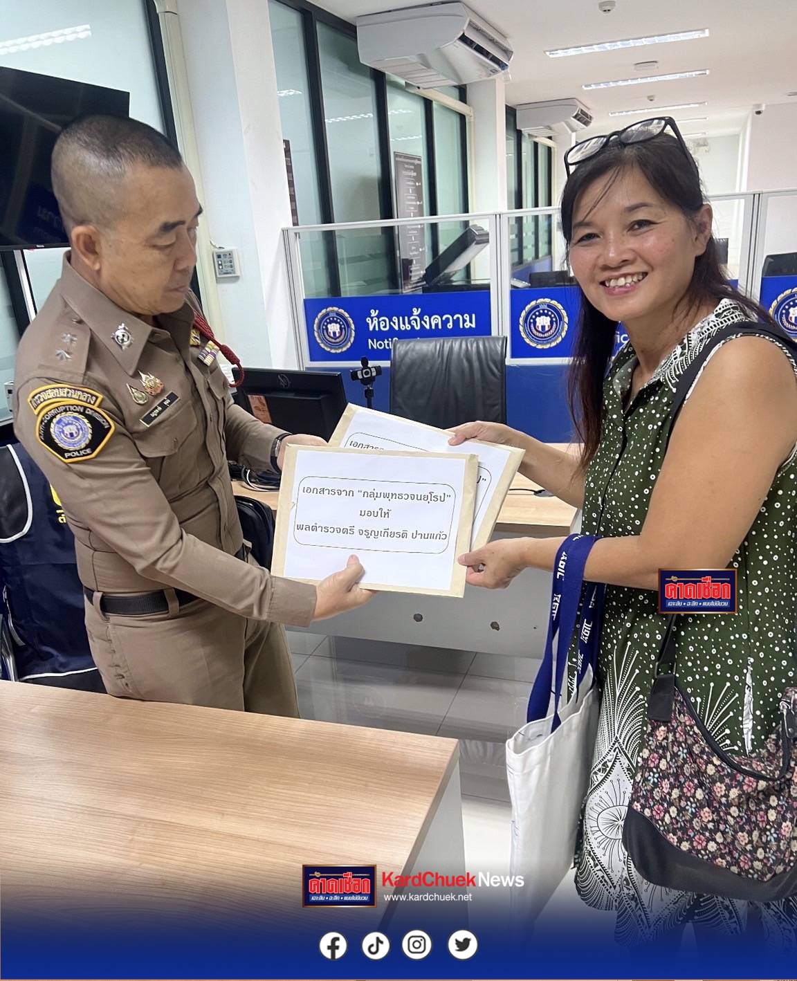 เมื่อเวลา 09.30 น. วันที่ 6 ต.ค. 68 ที่ ศูนย์รับแจ้งความ กองบัญชาการตำรวจสอบสวนกลาง (บช.ก.) นางยุพิน (สงวนนามสกุล) และ และ นางแหม่ม (สงวนนามสกุล) ตัวแทนสมาคมพุทธวจนในยุโรป และนายนายนิวัติ (สงวนนามสกุล) ได้เดินทางมายื่นเอกสารหลักฐานเกี่ยว กับข้อมูลส่วนตัวเกี่ยวกับจัดงานที่ยุโรป ให้กับ พล.ต.ต.จรูญเกียรติ ปานแก้ว รอง ผบช.ก. โดยมีพนักงานสอบสวน บก.ปปป.เป็นผู้รับแทน
