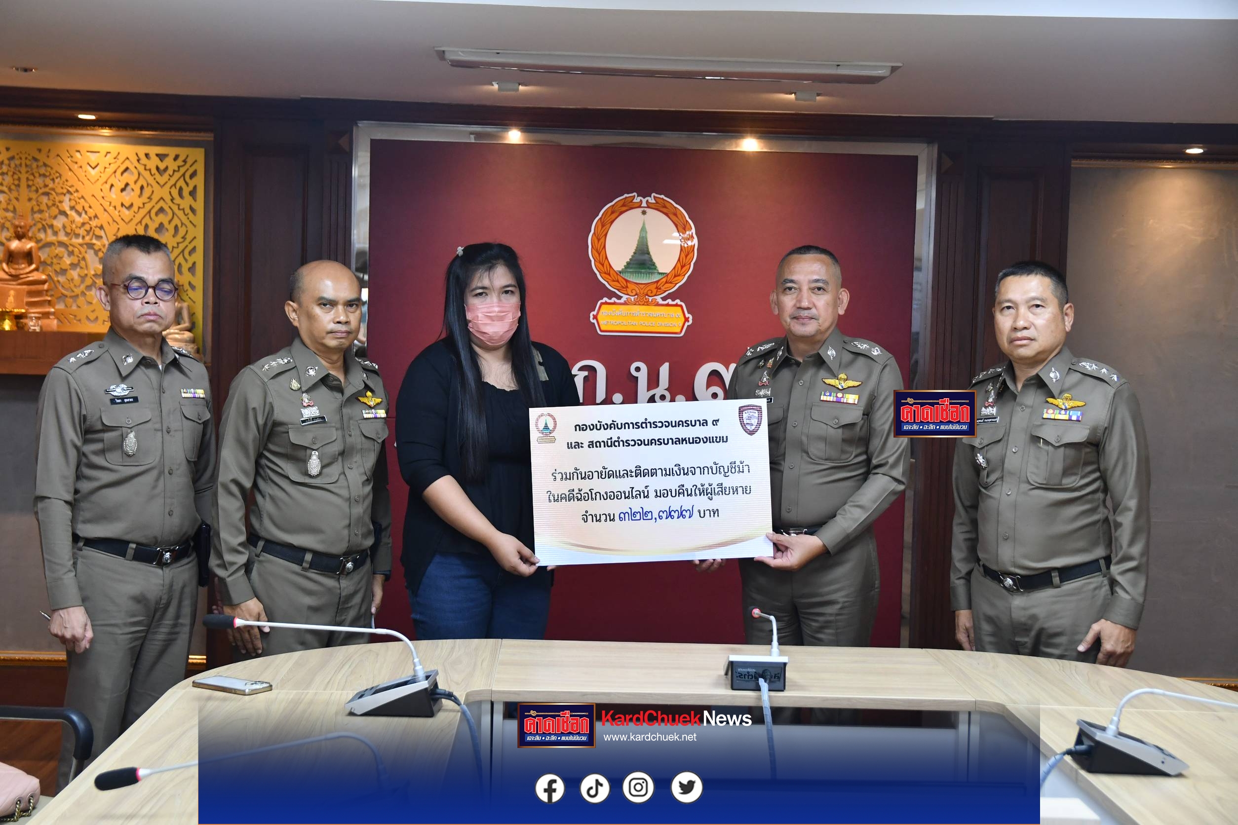 เมื่อเวลา 13.30 น. วันที่ 9 มี.ค. ที่กองบังคับการตำรวจนครบาล 9 พล.ต.ต.สามารถ พรหมชาติ ผบก.น.9 พร้อม พ.ต.อ.คงศักดิ์ ปานน้อย ผกก.สน.หนองแขม ร่วมกันแถลงข่าวผลดำเนินการปิดเพจและกรุ๊ปไลน์ขายเสื้อผ้ามือสอง ซึ่งก่อเหตุฉ้อโกงเงินของกลุ่มผู้ค้า โดยวางกลอุบายให้โอนเงินเข้าบัญชีม้า และ สามารถอายัดเงินคืนให้กับผู้เสียหายได้ จำนวน 322,777 บาท