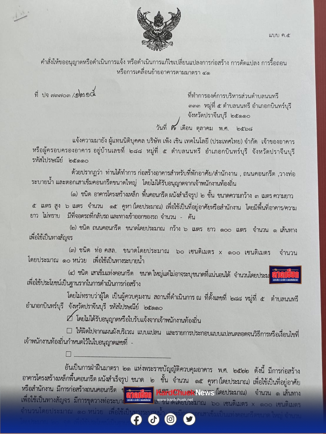 ชนิดอาคารโรงเหล็ก พื้นผนังคอนกรีตสำเร็จรูป 2 ชั้นขนาด 3 เมตรกว้าง 5 เมตรสูง 6 เมตรจำนวน 15 คูหาโดยประมาณ เพื่อใช้เป็นที่อยู่อาศัยหรือสำนักงาน โดยมีพื้นที่อาคารความยาวไม่ทราบมีพื้นที่จอดรถที่กลับรถ และทางเข้าออกของรถ เทคอนกรีตขนาดโดยประมาณ 6 เมตรยาว 100 เมตรจำนวน 1 เส้นเพื่อใช้เป็นทางสัญจร ชนิดท่อคสล. ขนาดโดยประมาณ 60× 100 เซนติเมตรจำนวน 10 หน่วย เพื่อใช้เป็นทางระบายน้ำ เสาเข็มชนิดแท่งคอนกรีตขนาดใหญ่ไม่ขาดระบุขนาดที่แน่นอนได้จำนวน 20จุด เพื่อใช้ประโยชน์เป็นรากฐานในการดำเนินการก่อสร้าง ไม่ทราบผู้ใดเป็นผู้คุมงาน สถานที่ดำเนินการโดยไม่ได้รับอนุญาต หรือใบรับแจ้งจากเจ้าพนักงานฯก่อนหน้านี้บริษัทฯได้ขออนุญาตก่อสร้างโรงงานถูกต้องจำนวน 1 โรง และมีการขยายพื้นที่ก่อสร้างด้านข้างเพิ่มเติมอีก …