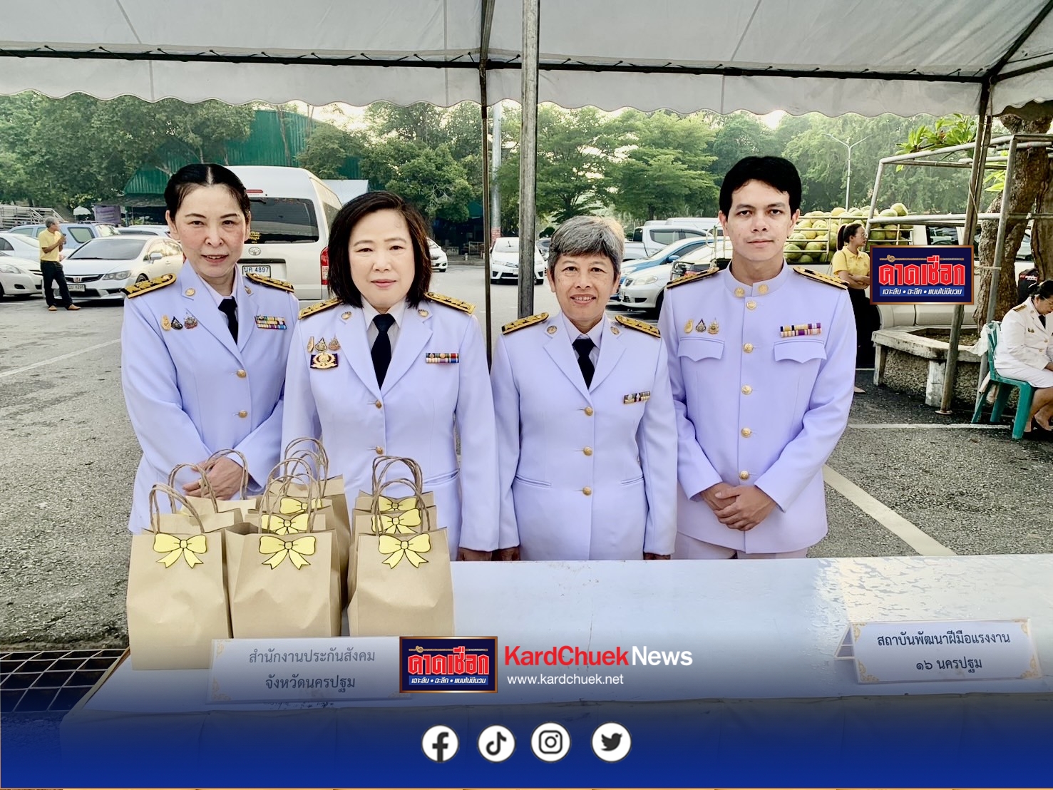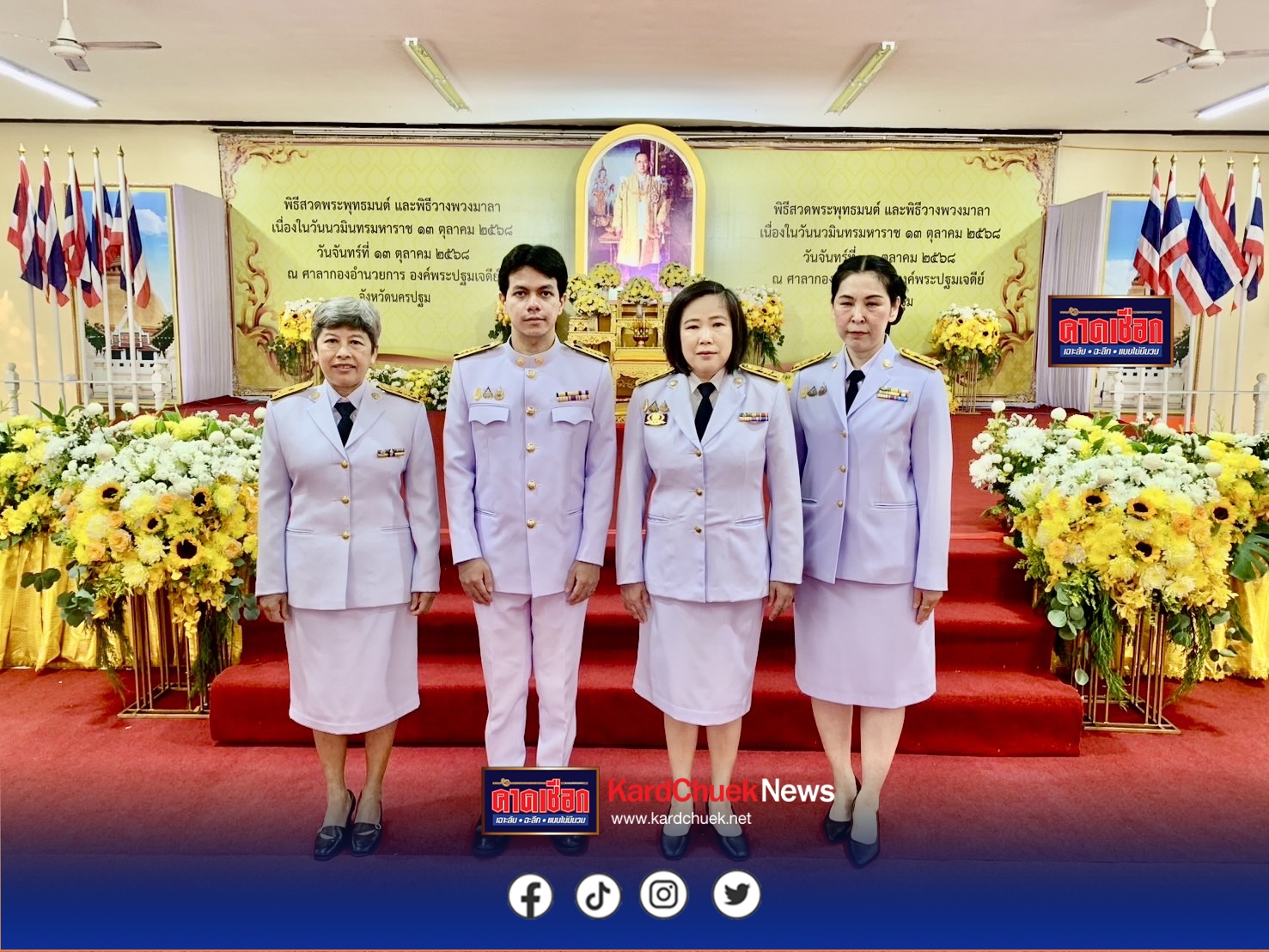 นครปฐม-สำนักงานประกันสังคมจังหวัดนครปฐมร่วมพิธีวันนวมินทรมหาราช ..เมื่อวันที่ 13 ตุลาคม 2568 ที่จังหวัดนครปฐมกิจกรรมวันนวมินทรมหาราชวันที่ 13 ตุลาคม 2568 น้อมรำลึกในพระมหากรุณาธิคุณ พระบาทสมเด็จพระบรมชนกาธิเบศรมหาภูมิพลอดุลยเดชมหาราช บรมนาถบพิตรด้วยสำนึกในพระมหากรุณาธิคุณอันหาที่สุดมิได้ นางสาวสุกิจจา วานิชพงษ์พันธุ์ ประกันสังคมจังหวัดนตรปฐม สำนักงานประกันสังคมจังหวัดนครปฐม พร้อม ข้าราชการ พนักงาน ลูกจ้าง สังกัดกระทรวงแรงงานร่วม เข้าร่วมพิธีเจริญพระพุทธมนต์ทำบุญตักบาตรถวายพระราชกุศลและพิธีวางพวงมาลา เพื่อน้อมรำลึกในพระมหากรุณาธิคุะมหากรุณาธิคุณ เนื่องในวันคล้ายวันสวรรคต พระบาทสมเด็จพระบรมชนกาธิเบศร มหาภูมิพลอดุลยเดชมหาราช บรมนาถบพิตร ณ ศาลากองอำนวยการองค์พระปฐมเจดีย์ อำเภอเมืองนครปฐม จังหวัดนครปฐม