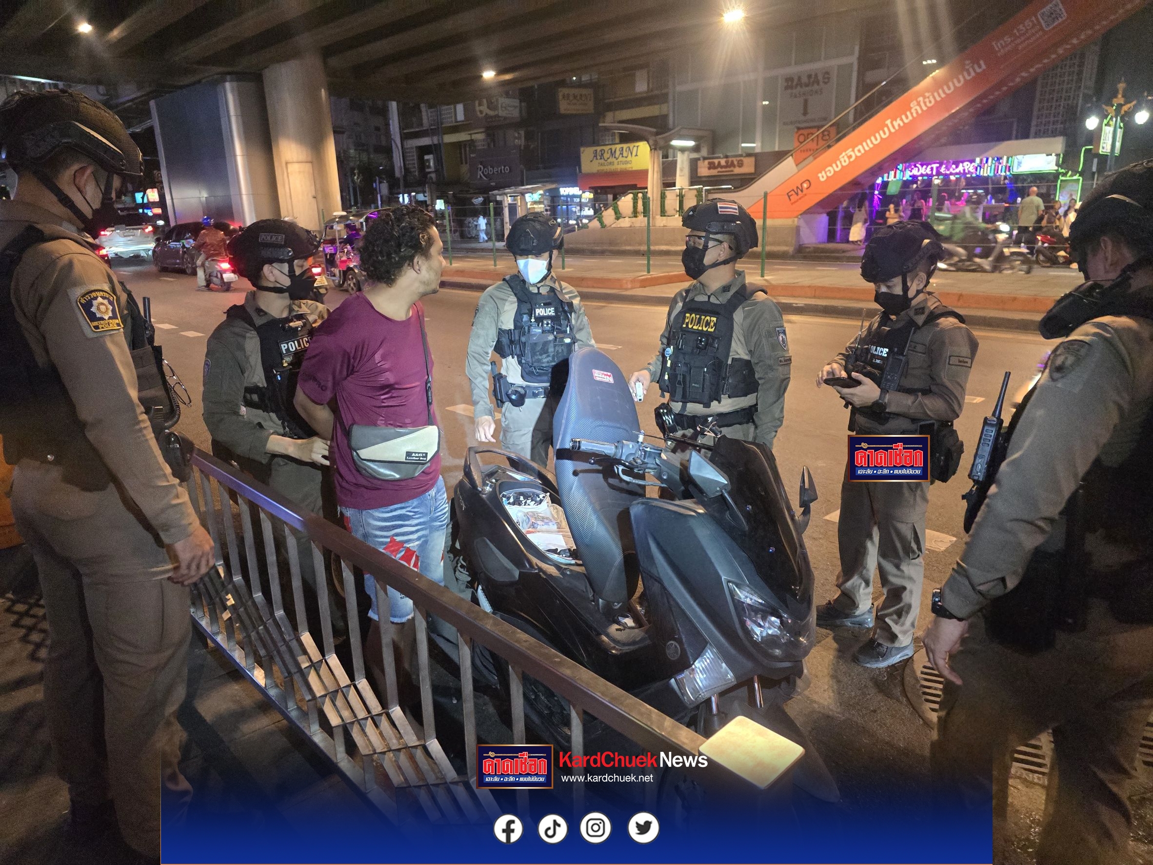 เจ้าหน้าที่สามารถจับกุมผู้ต้องหาได้บริเวณหน้าร้าน THE GAME BANGKOK ถนนสุขุมวิท แขวงคลองเตย เขตวัฒนา กรุงเทพมหานคร พร้อมของกลาง ได้แก่