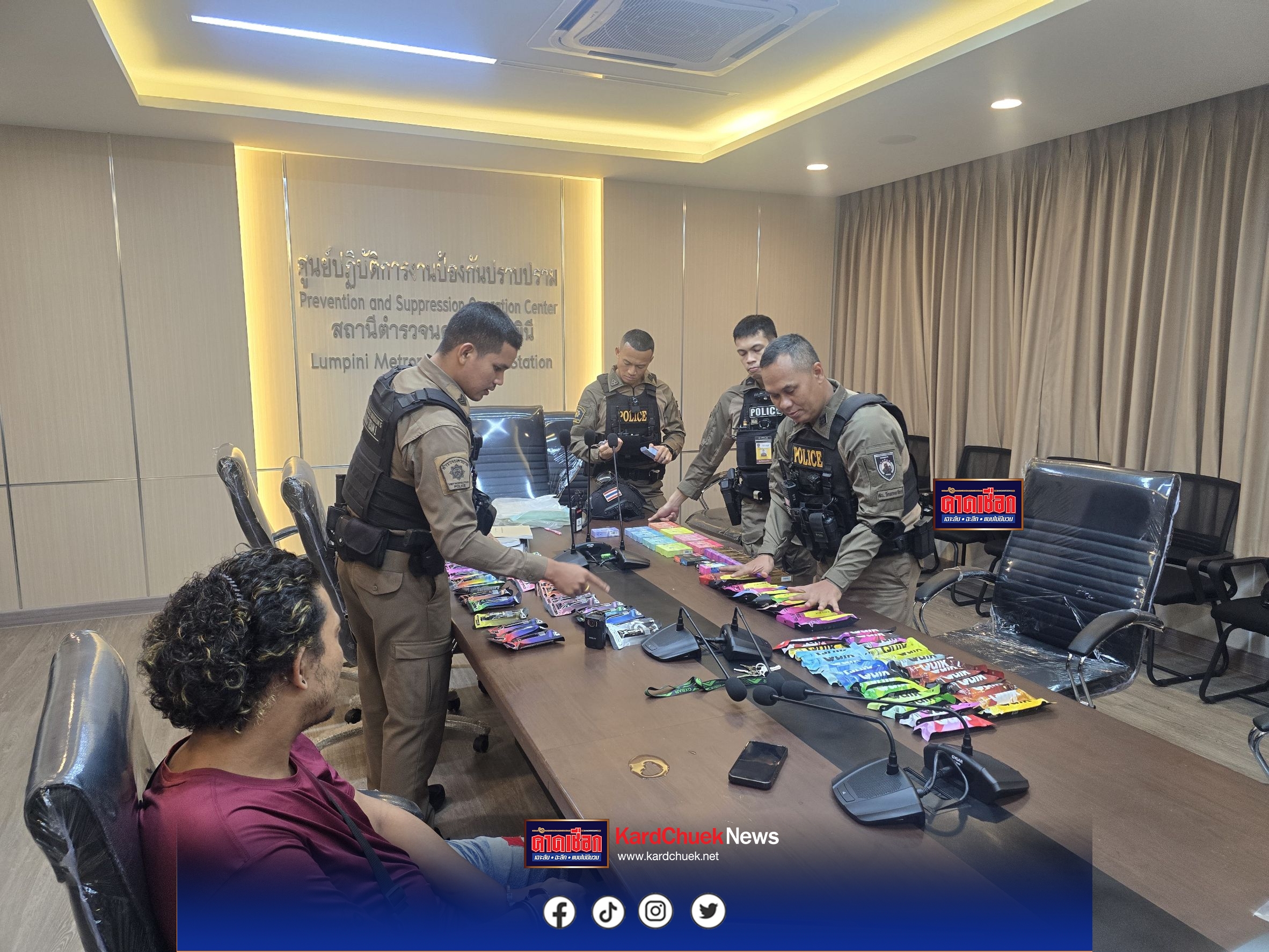 หลังสอบสวนเบื้องต้น เจ้าหน้าที่ได้แจ้งข้อกล่าวหาและสิทธิตามกฎหมาย ก่อนควบคุมตัวพร้อมของกลางส่งพนักงานสอบสวน สน.ลุมพินี ดำเนินคดีตามกฎหมายต่อไป