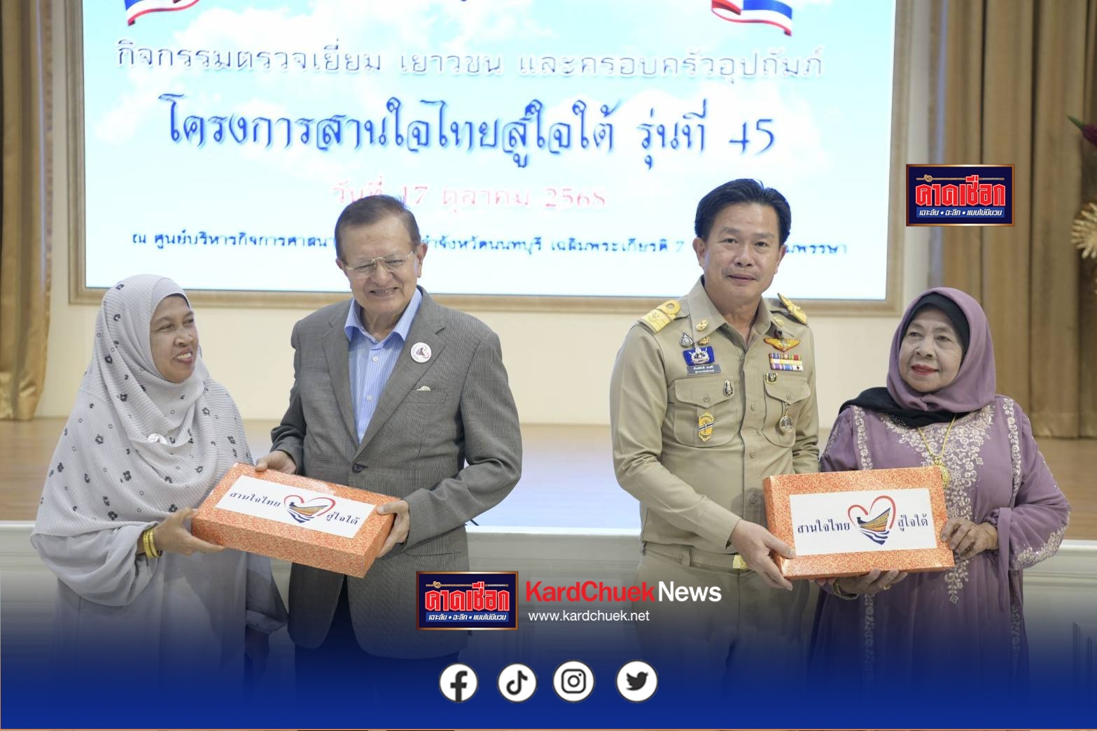 วันนี้ (๑๗ ตุลาคม ๒๕๖๘) เวลา ๑๔.๓๐ น. ณ ศูนย์บริหารกิจการศาสนาอิสลามประจำจังหวัดนนทบุรี ตำบลละหาร อำเภอบางบัวทอง จังหวัดนนทบุรี นายอารีย์ วงศ์อารยะ ประธานกรรมการบริหารมูลนิธิฯ เป็นประธานตรวจเยี่ยมโครงการ “สานใจไทย สู่ใจใต้” รุ่นที่ ๔๕ โดยมีนายเกียรติศักดิ์ ตรงศิริ ผู้ว่าราชการจังหวัดนทบุรี ต้อนรับคณะกรรมการฯ ซึ่งโครงการดังกล่าวมี วัตถุประสงค์เพื่อให้เยาวชนในจังหวัดชายแดนภาคใต้ได้มีโอกาสเรียนรู้สภาพความเป็นอยู่ วิถีชีวิตของครอบครัวมุสลิม และครอบครัวพุทธในจังหวัดนนทบุรี เพื่อเสริมสร้างทักษะการเรียนรู้ วิสัยทัศน์ ประสบการณ์ชีวิต และการพัฒนาแนวความคิดของเยาวชนให้สามารถปฏิบัติตนเป็นผู้นำที่ดีของชุมชนในอนาคตเพื่อเสริมสร้างความสัมพันธ์ และเชื่อมโยงเครือข่ายระหว่างครอบครัวอุปถัมภ์สามารถนำไปใช้ในการดำเนินชีวิตในอนาคตได้เป็นอย่างดี ซึ่งจังหวัดนนบุรีเข้าร่วมโครงการฯ ครั้งนี้ เป็นรุ่นที่ ๔๕ ระหว่างวันที่ ๒๗ กันยายน – ๒๘ ตุลาคม ๒๕๖๘ โดยเยาวชนจะพักอาศัยกับครอบครัวอุปถัมภ์ในพื้นที่จังหวัดนนทบุรีประกอบไปด้วย อำเภอบางบัวทอง ๘ ครอบครัว, อำเภอปากเกร็ด ๓ ครอบครัว, อำเภอเมืองนนทบุรี ๓ ครอบครัว, อำเภอบางใหญ่ ๑ ครอบครัว และอำเภอบางกรวย ๒ ครอบครัว โดยเป็นครอบครัวศาสนาอิสลาม ๑๒ ครอบครัว ครอบครัวศาสนาพุทธ ๕ ครอบครัว รวม ๑๗ ครอบครัว และเยาวชนจำนวน ๓๔ ค