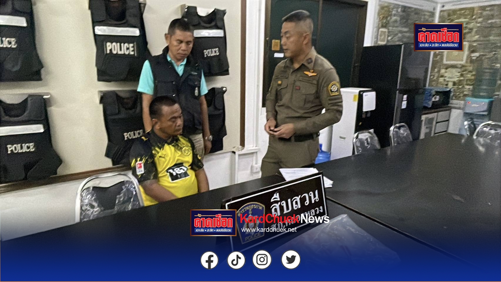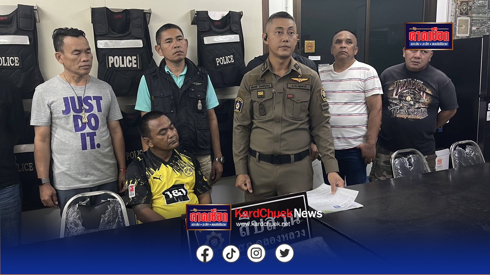 คืบหน้าเมื่อเวลา 15.00 น. วันที่ 23 ตุลาคม 2568 ที่สภ.คลองหลวง จ.ปทุมธานี พ.ต.อ.อธิเมศร์ ไชยศรัญวิชย์ ผกก.สภ.คลองหลวง พ.ต.ท.ฉลาด หอมเงิน รอง ผกก.สส.สภ.คลองหลวง พร้อมกำลังชุดสืบสวน ได้ร่วมกันจับกุม นายศิริศักดิ์ หรือบังมอส วุฒิคุณ อายุ 42 ปี อยู่เลขที่ 7/94 ม.5 ต.คลองหนึ่ง อ.คลองหลวง จ.ปทุมธานี เจ้าหนี้โหด ขณะหลบช่อนตัวอยู่บริเวณสวนสาธารณะในชุมชนหมู่บ้านไวท์เฮาส์ ม.6 ต.คลองหนึ่ง อ.คลองหลวง จ.ปทุมธานี พร้อมของกลาง ชุดเสื้อแขนสั้นคอกลมสีขาว-แดงรองเท้าแตะสีแดงดำ