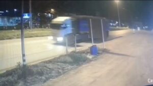 ในภาพรถบรรทุกหัวสีขาวตัวรถสีน้ำเงินวิ่งมุ่งหน้าฉะเชิงเทรา ก่อนถึงจุดรับแจ้งเหตุฯมีบางอย่างหลุดล่วงหล่นออกจากตัวรถกลิ้งไปตามถนน แล้วสิ่งของขนาดใหญ่พุ่งเข้าไปชนรถตู้ยี่ห้อtoyota สีขาวทะเบียน นข 4019 ปราจีนบุรี บริเวณตัวรถด้านขวามีรอยขีดข่วน แล้วแฉลบไปกระทบเสาเหล็กแล้วกลิ้งไปอยู่ที่ท้ายรถคันดังกล่าว
