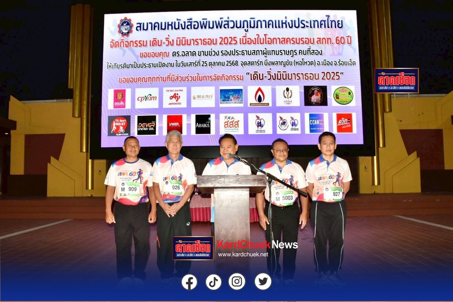 เมื่อวันที่ 25 ต.ค.2568 สมาคมหนังสือพิมพ์ส่วนภูมิภาคแห่งประเทศไทย จัดกิจกรรมเดิน–วิ่ง มินิมาราธอนการกุศล “สภท. 60 ปี” เนื่องในโอกาสครบรอบ 60 ปีแห่งการก่อตั้งสมาคมฯ ณ บริเวณลานสาเกตนคร บึงพลาญชัย (หอโหวด 101) อำเภอเมือง จังหวัดร้อยเอ็ด โดยได้รับเกียรติจาก ดร.ฉลาด ขามช่วง รองประธานสภาผู้แทนราษฎร คนที่สอง เป็นประธานในพิธีเปิดกิจกรรม และยังได้รับเกียรติจาก นายชัชวาลย์ เบญจสิริวงศ์ ผู้ว่าราชการจังหวัดร้อยเอ็ด, นายพิชัยยา ตุระซอง รองผู้ว่าราชการจังหวัดร้อยเอ็ด, นายบรรจง โฆษิตจิรนันท์ นายกเทศมนตรีเทศบาลเมืองร้อยเอ็ด, พ.ต.อ.ไกร สอนสี รองผู้บัญชาการตำรวจภูธรจังหวัดร้อยเอ็ด เข้าร่วมกิจกรรมและร่วมวิ่งไปพร้อมกับประชาชนและสื่อมวลชน อีกทั้งยังได้รับเกียรติจากนายสัญญา พรนารายณ์ ศิลปินลูกทุ่งอมตะนิรันดร์กาลร่วมขับร้องเพลง และสร้างบรรยากาศคึกคักแบบเป็นกันเองตลอดเส้นทาง