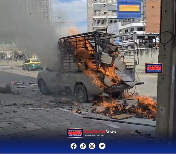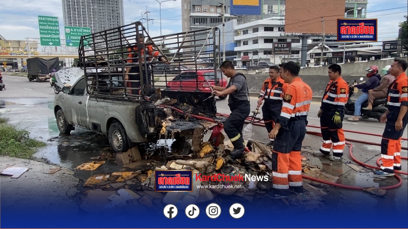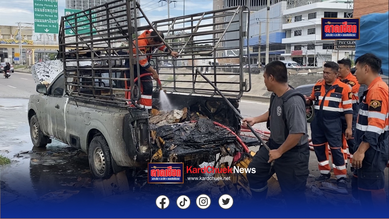 นนทบุรี คลิป ระทึก เพลิงไหม้รถกระบะเก็บของเก่าวอด คนขับวิ่งหนีตายลงจากรถ โชคดีไร้คนเจ็บ