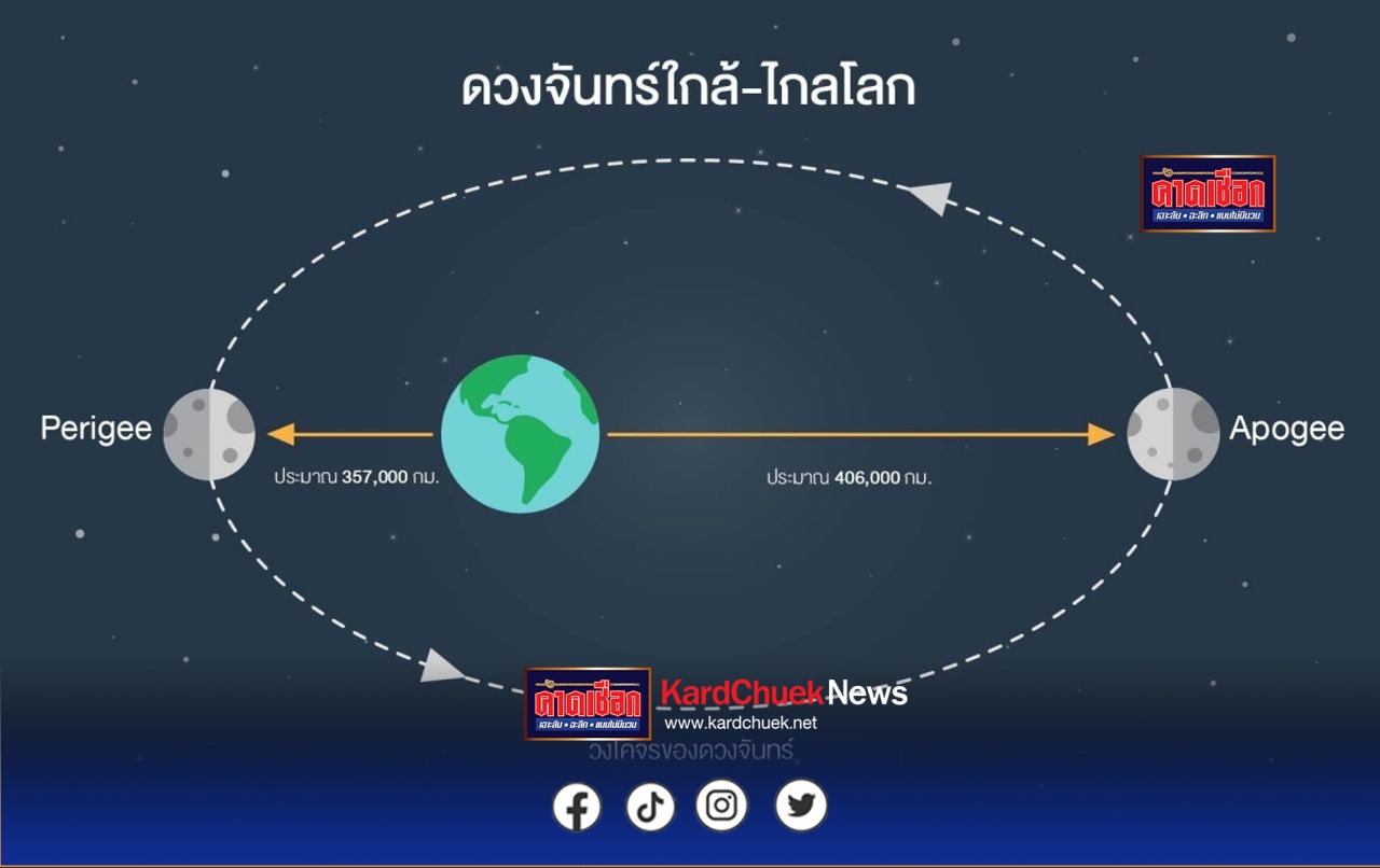 และมีรูปแบบการโคจรเป็นวงรี ส่งผลให้ในแต่ละเดือนดวงจันทร์จะมีตำแหน่งที่ใกล้โลกที่สุด เรียกว่า เปริจี (Perigee) มีระยะทางเฉลี่ยประมาณ 357,000 กิโลเมตร และตำแหน่งที่ไกลโลกที่สุด เรียกว่า อะโปจี (Apogee) มีระยะทางเฉลี่ยประมาณ 406,000 กิโลเมตร การที่คนบนโลกสังเกตเห็นดวงจันทร์มีขนาดเล็กหรือใหญ่กว่าปกตินั้น เป็นเหตุการณ์ที่สามารถอธิบายได้ตามหลักวิทยาศาสตร์