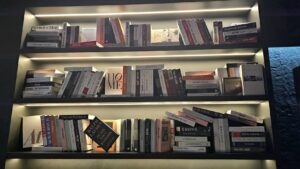 ภายในร้านตกแต่งด้วยผนังหนังสือจำลองนับร้อยเล่ม แสงไฟนุ่ม และเฟอร์นิเจอร์กำมะหยี่สีเข้ม ทุกอย่างถูกจัดวางให้บรรยากาศนิ่งพอที่จะทำให้คนอยู่ได้นาน —
