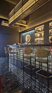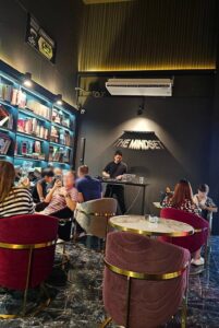 ภายในร้านตกแต่งด้วยผนังหนังสือจำลองนับร้อยเล่ม แสงไฟนุ่ม และเฟอร์นิเจอร์กำมะหยี่สีเข้ม ทุกอย่างถูกจัดวางให้บรรยากาศนิ่งพอที่จะทำให้คนอยู่ได้นาน —