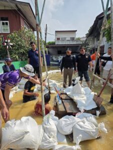 เจ้าหน้าที่ตำรวจได้ร่วมแรงกับชาวบ้านช่วยกัน ขนกระสอบทรายกั้นแนวทางน้ำรอบวัดและบริเวณบ้านเรือนประชาชน เพื่อบรรเทาความเดือดร้อนและลดความเสียหายที่อาจเกิดขึ้นกับพื้นที่ศาสนสถานและชุมชนโดยรอบ ขณะเดียวกันยังได้สำรวจเส้นทางสัญจรในพื้นที่น้ำท่วม เพื่ออำนวยความสะดวกให้กับประชาชนที่ต้องใช้เส้นทางดังกล่าว