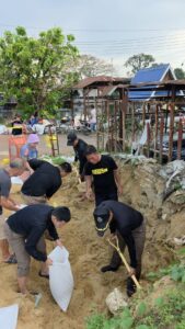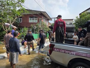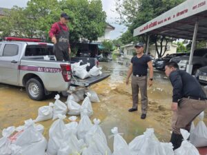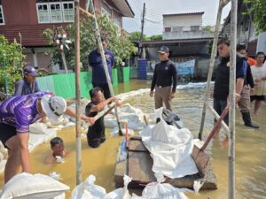 เจ้าหน้าที่ตำรวจได้ร่วมแรงกับชาวบ้านช่วยกัน ขนกระสอบทรายกั้นแนวทางน้ำรอบวัดและบริเวณบ้านเรือนประชาชน เพื่อบรรเทาความเดือดร้อนและลดความเสียหายที่อาจเกิดขึ้นกับพื้นที่ศาสนสถานและชุมชนโดยรอบ ขณะเดียวกันยังได้สำรวจเส้นทางสัญจรในพื้นที่น้ำท่วม เพื่ออำนวยความสะดวกให้กับประชาชนที่ต้องใช้เส้นทางดังกล่าว