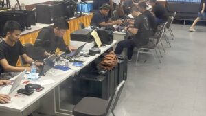 วงแหวน-รามอินทรา 2 แขวงท่าแร้ง เขตบางเขน กทม. จากการตรวจค้นพบอุปกรณ์ คอมพิวเตอร์ ตู้เซฟ บัตร เอทีเอ็ม ประมาณ 100 ใบ โทรศัพท์ 22 เครื่อง และเครื่องนับเงินจำนวนหนึ่ง ก่อนนำตัวผู้ต้องหาทั้ง 10 คน พร้อมด้วยของกลางนำส่ง พ.ต.ต.รัชตะ รัตนจงจิตรกร สว.(สอบสวน) สภ.คคต เพื่อดำเนินคดีตามกฎหมายต่อไป